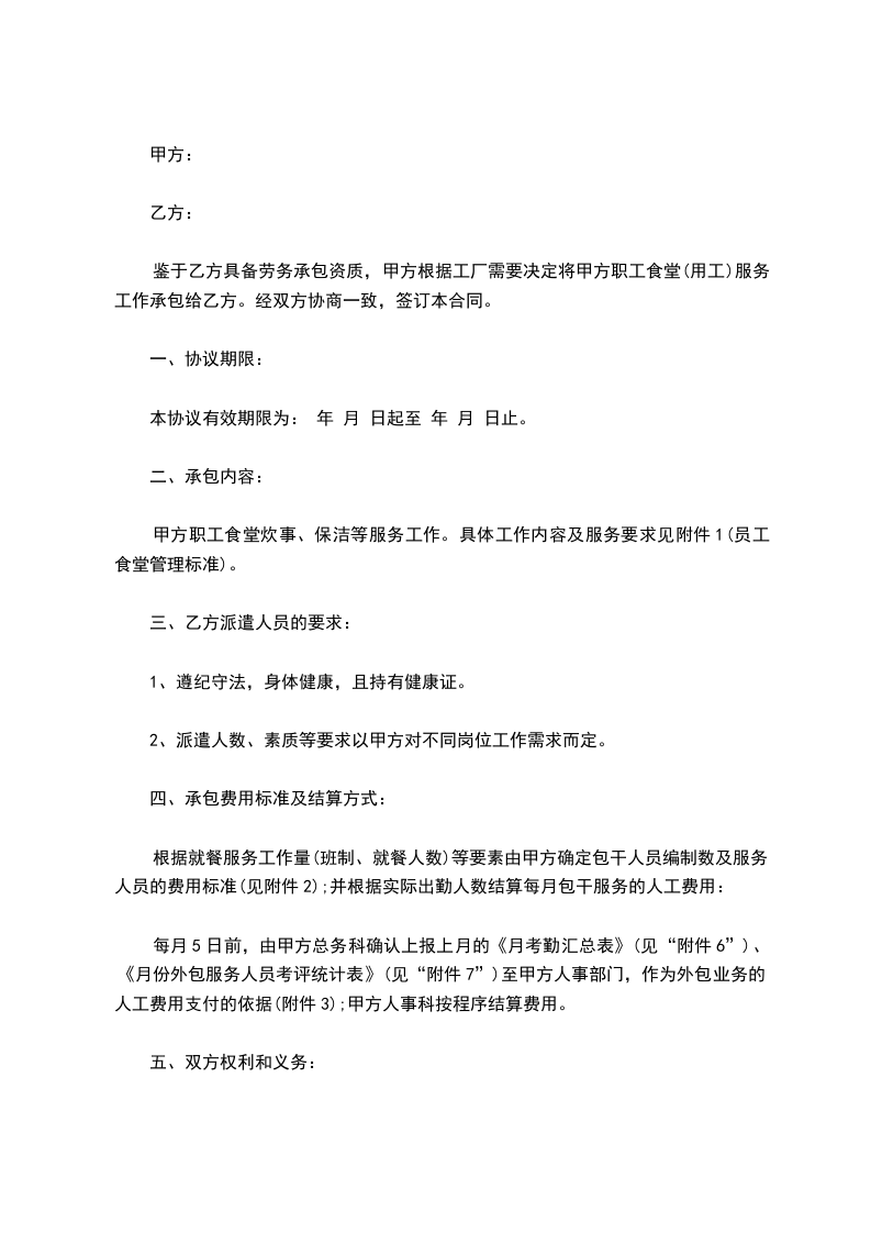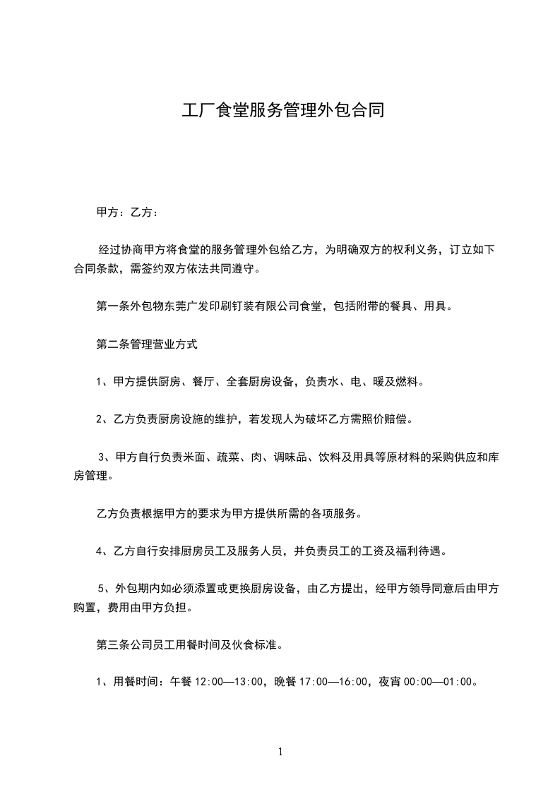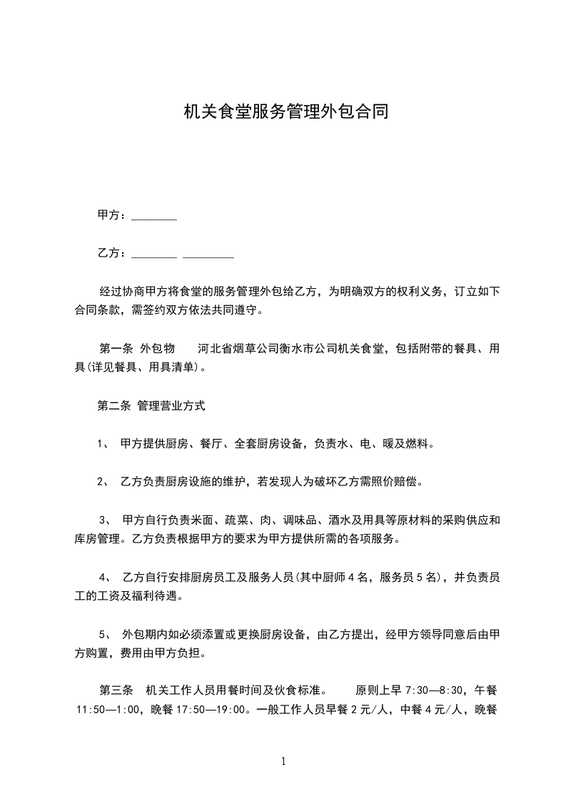 经过协商甲方将食堂的服务管理外包给乙方,为明确双方的权利义务,订立如下合同条款,需签约双方依法共同遵守。