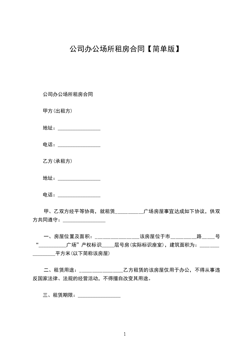 篇1《办公场所租赁简单协议》
