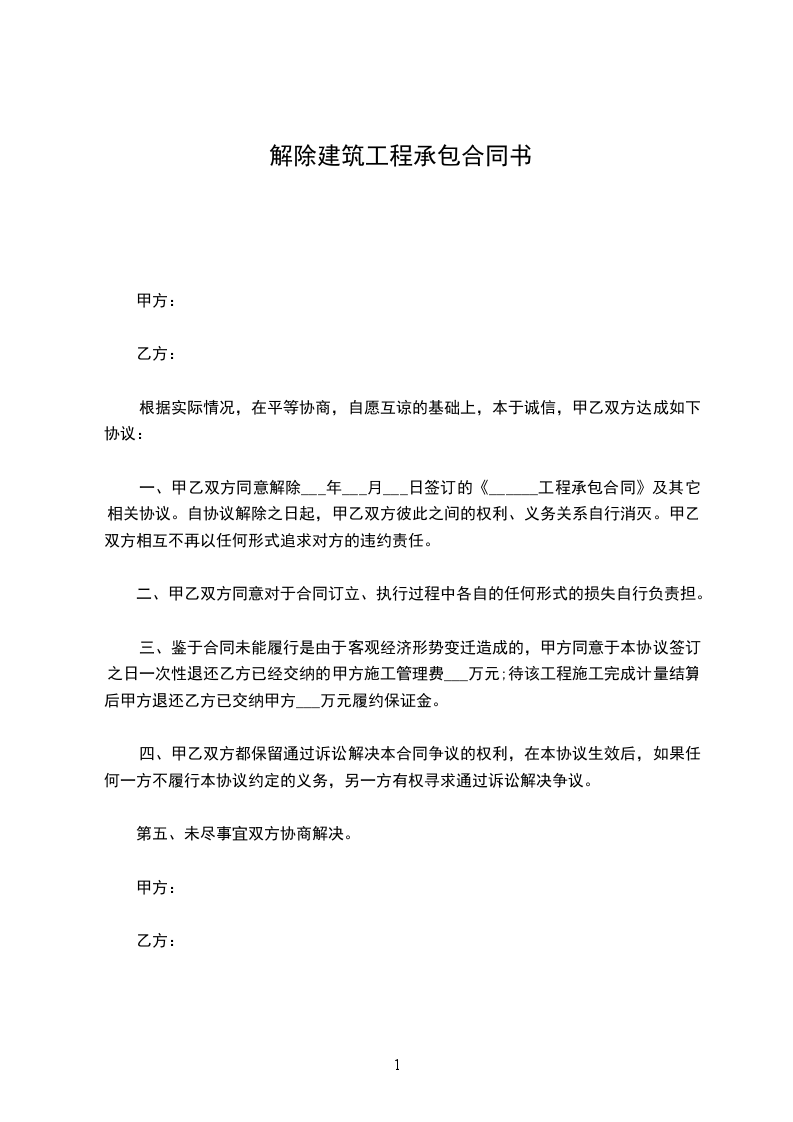 一、甲乙双方同意解除___年___月___日签订的《______工程承包合同》及其它相关协议。自协议解除之日起,甲乙双方彼此之间的权利、义务关系自行消灭。甲乙双方相互不再以任何形式追求对方的违约责任。