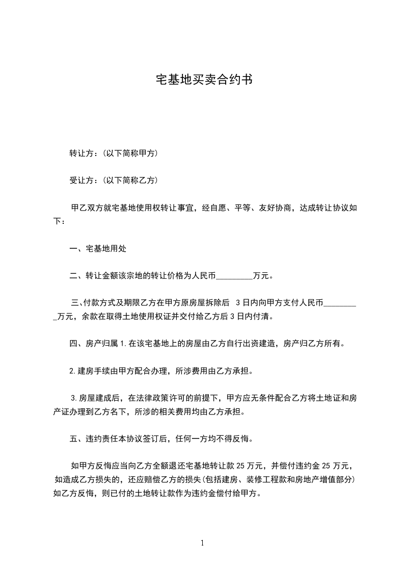 如甲方反悔应当向乙方全额退还宅基地转让款25万元,并偿付违约金25万元,如造成乙方损失的,还应赔偿乙方的损失(包括建房、装修工程款和房地产增值部分);如乙方反悔,则已付的土地转让款作为违约金偿付给甲方。