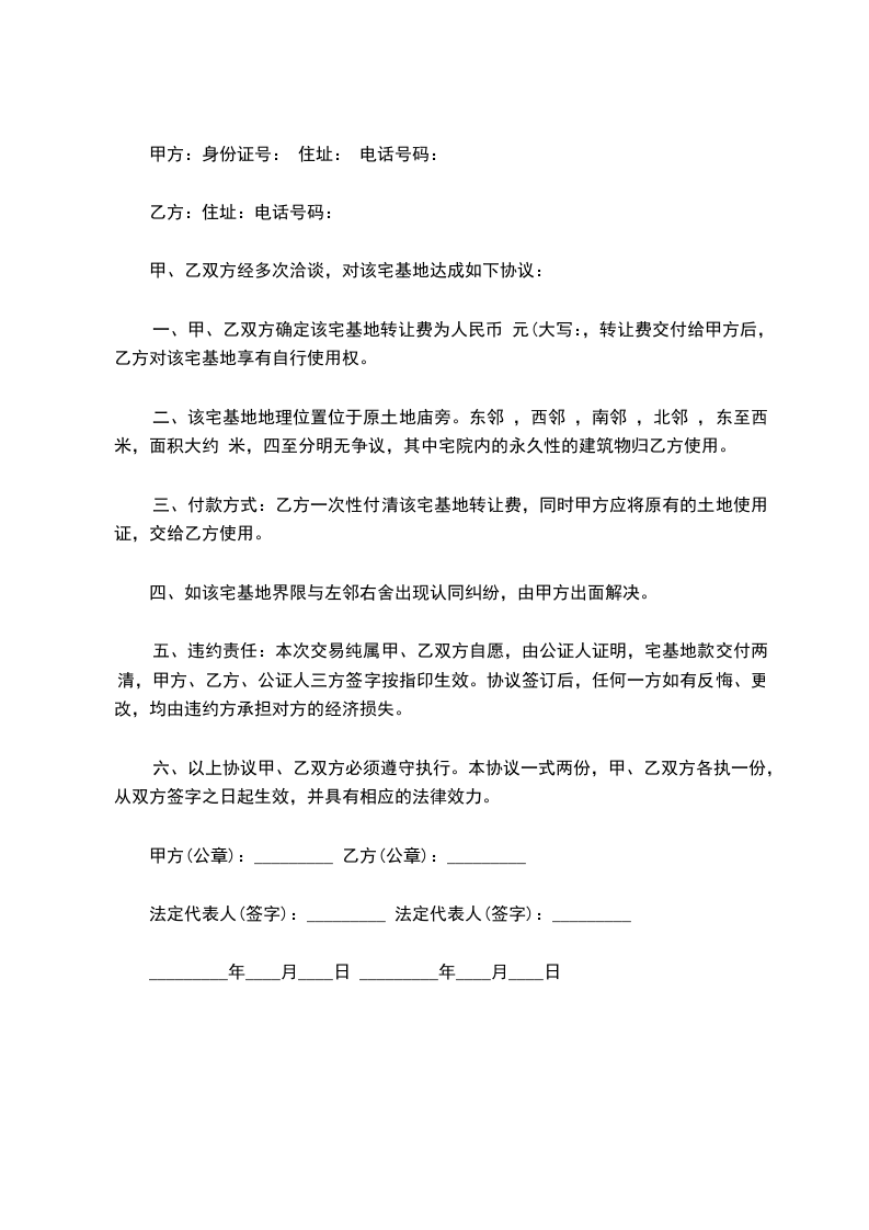 甲乙双方就宅基地使用权转让事宜,经自愿、平等、友好协商,达成转让协议如下:
