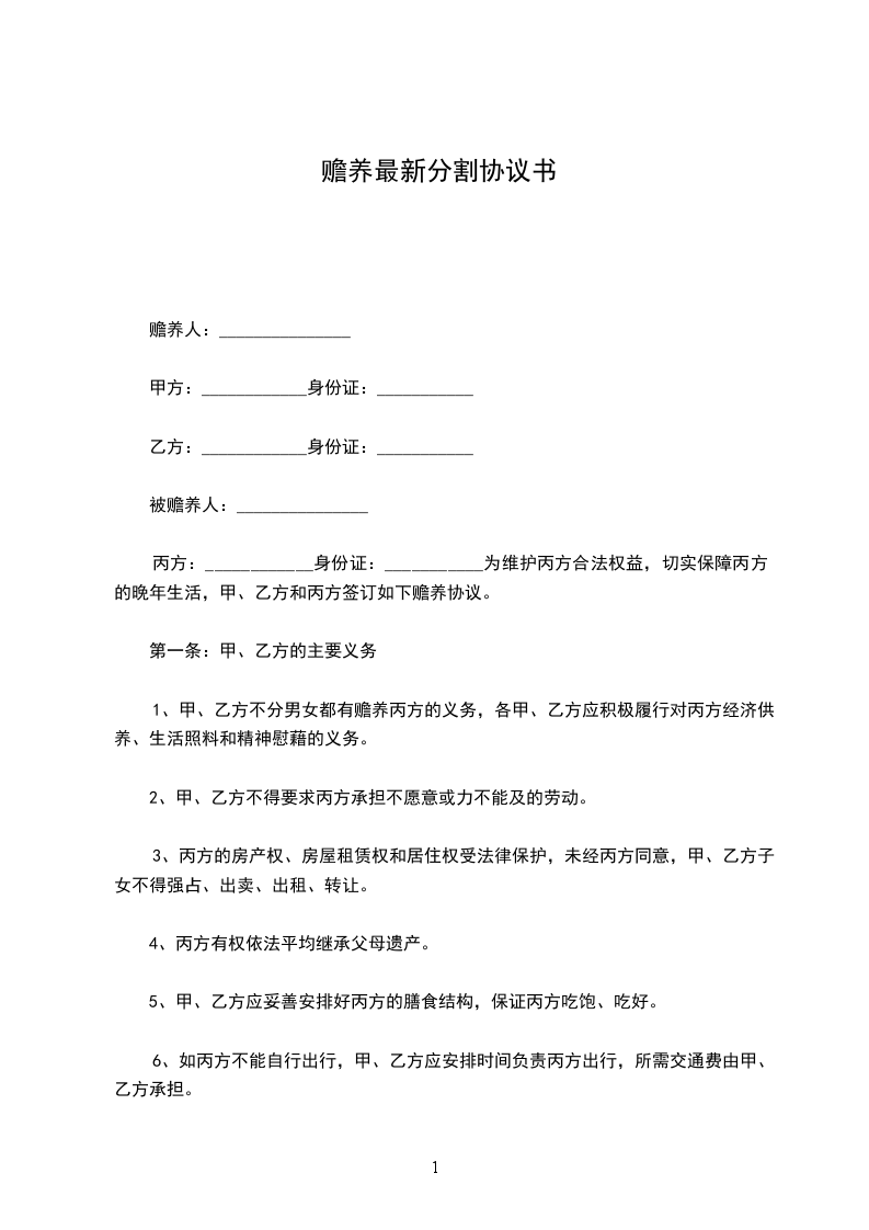 丙方:____________身份证:___________为维护丙方合法权益,切实保障丙方的晚年生活,甲、乙方和丙方签订如下赡养协议。