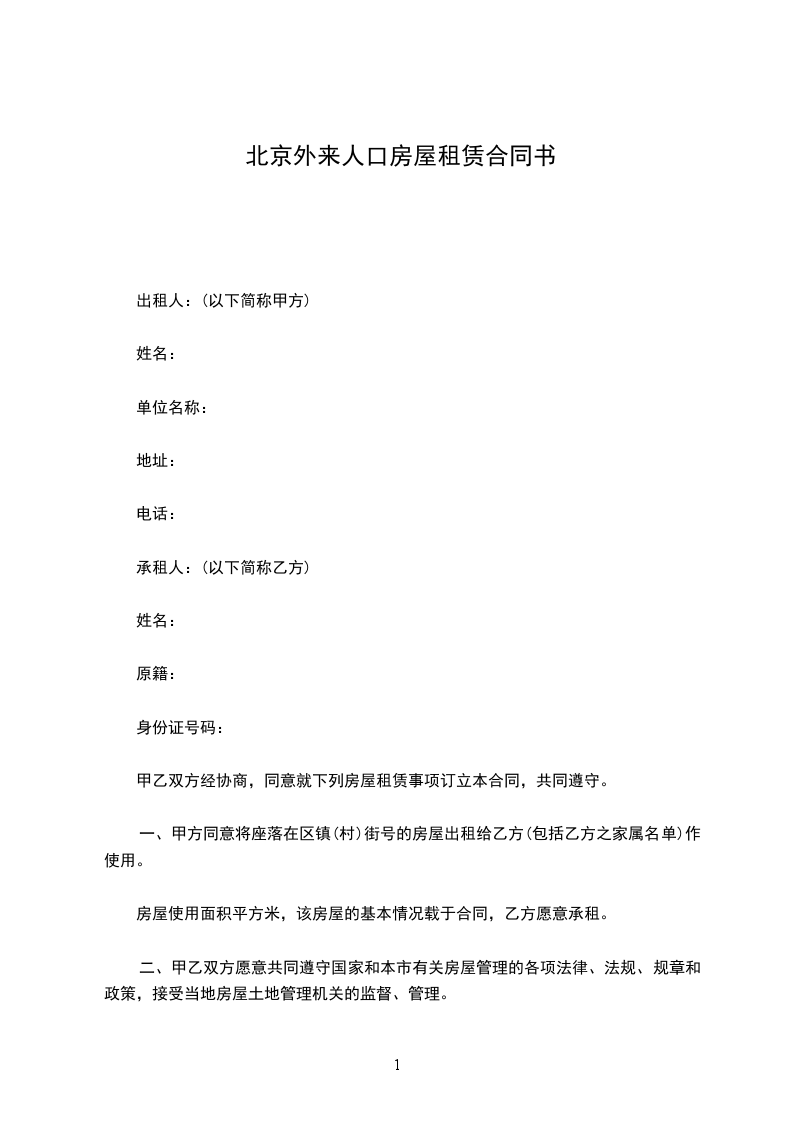 一、甲方同意将座落在区镇(村)街号的房屋出租给乙方(包括乙方之家属名单)作使用。