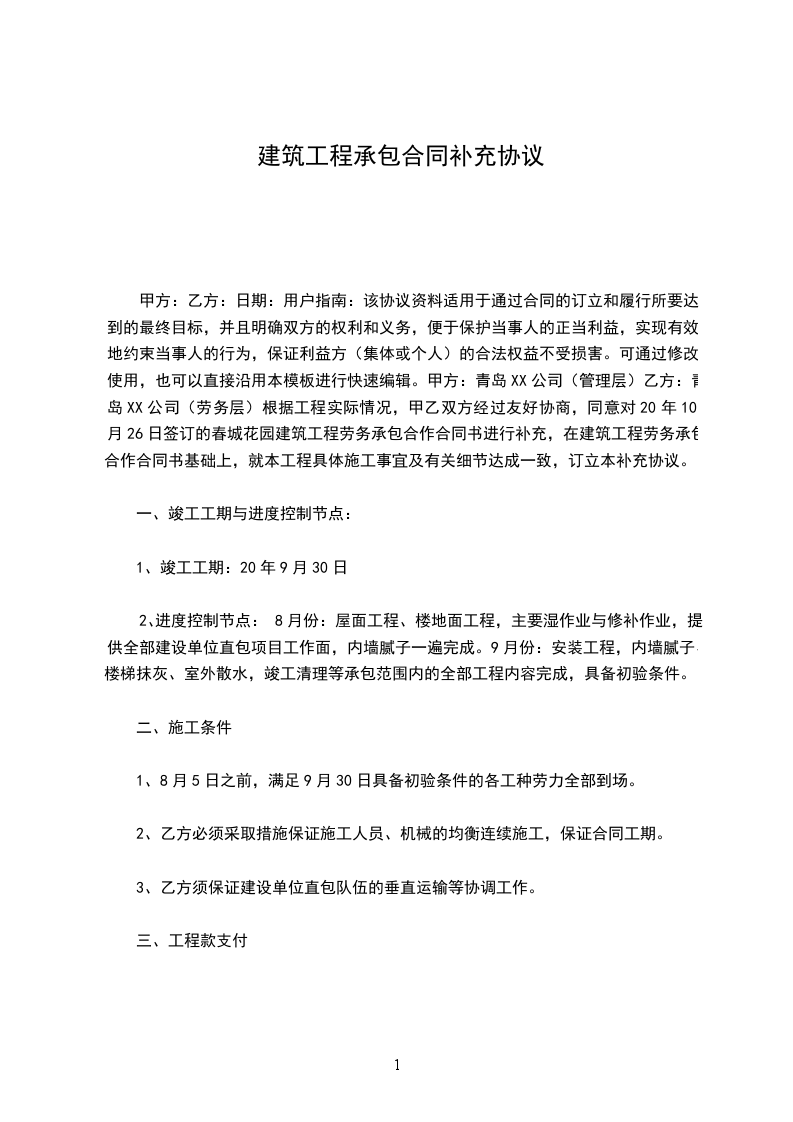 鉴于甲方与乙方于______年____月____日签订了《建筑工程总承包合同》(以下简称“主合同”),为了进一步明确双方的权利和义务,根据主合同的约定及实际情况,经双方友好协商,达成以下补充协议: