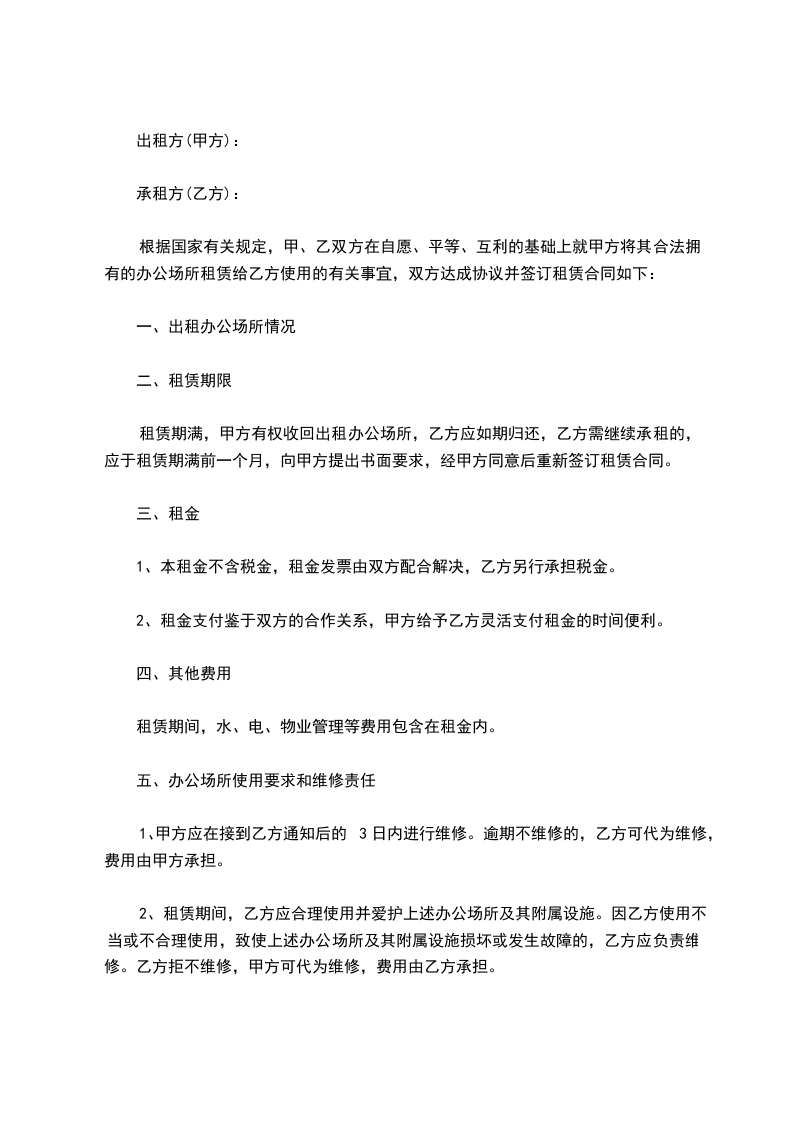 1. 办公场所的维修和保养由甲方负责。如因乙方使用不当或人为原因导致办公场所或设施损坏,乙方应负责修复或赔偿。