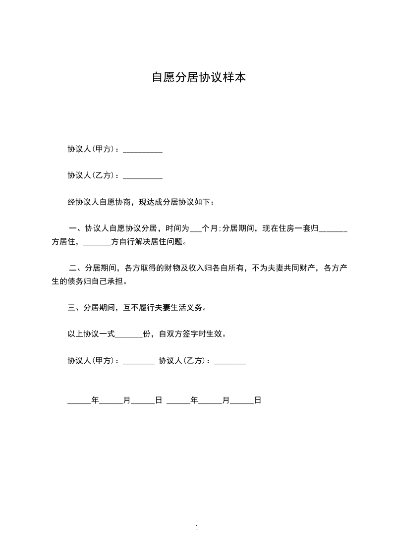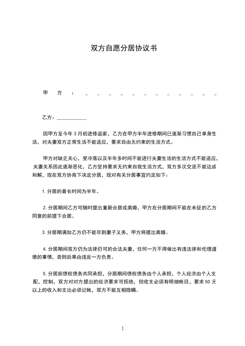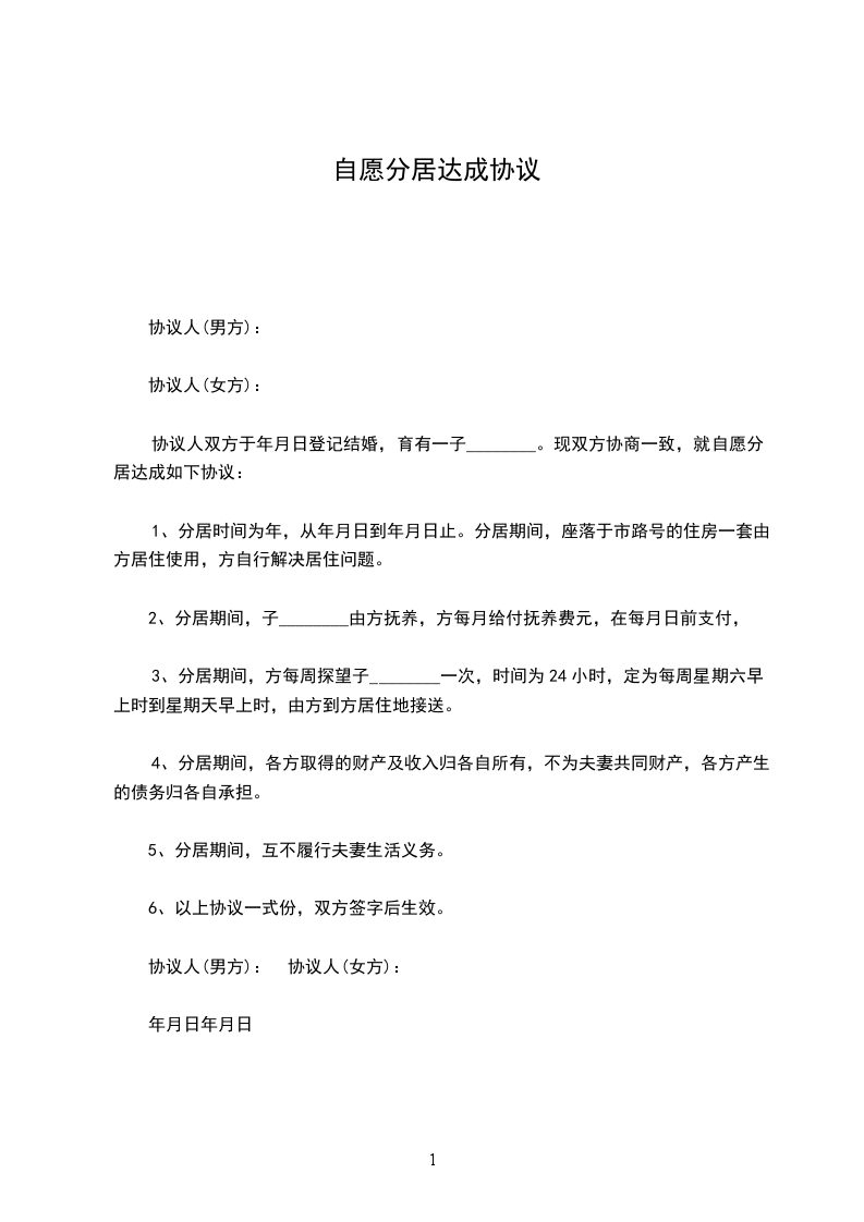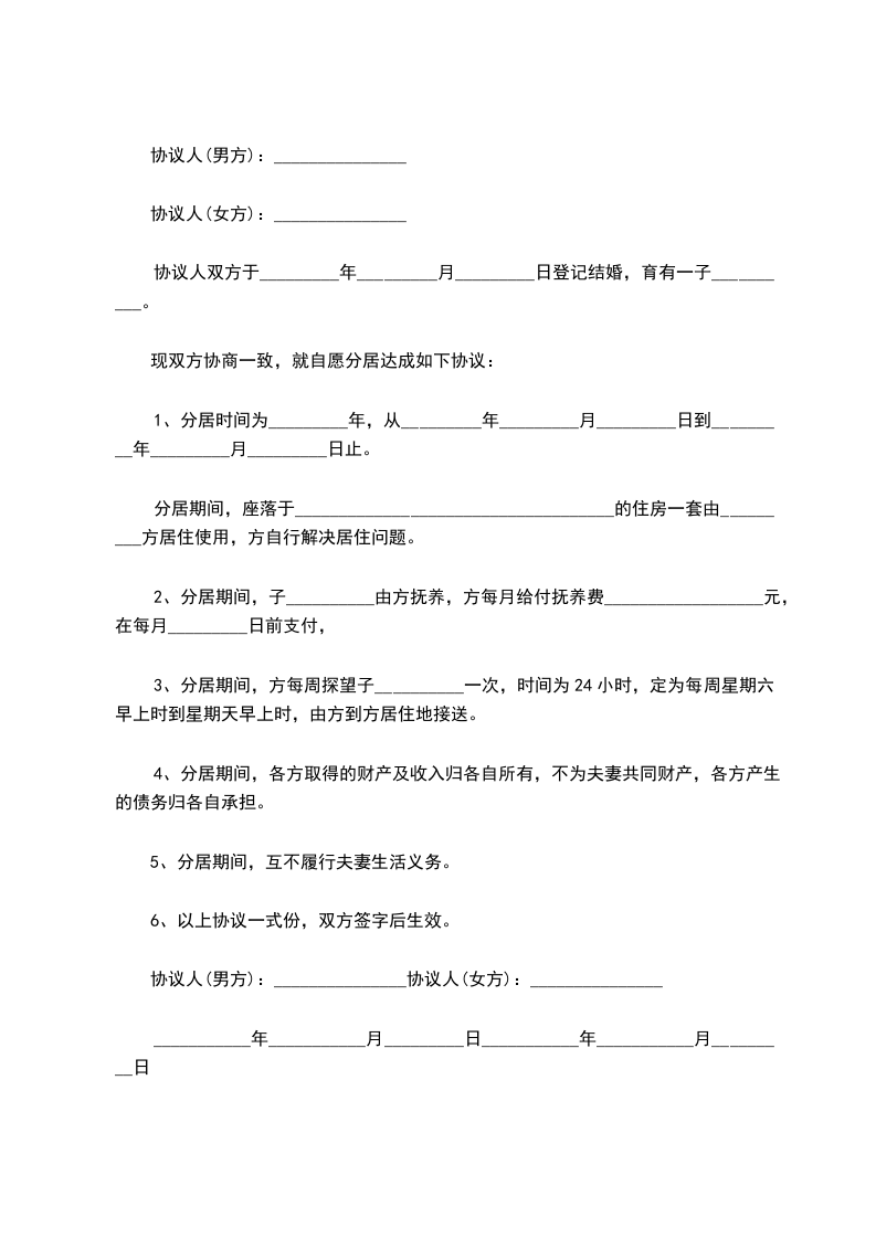一、协议人自愿协议分居,时间为___个月;分居期间,现在住房一套归_______方居住,_______方自行解决居住问题。
