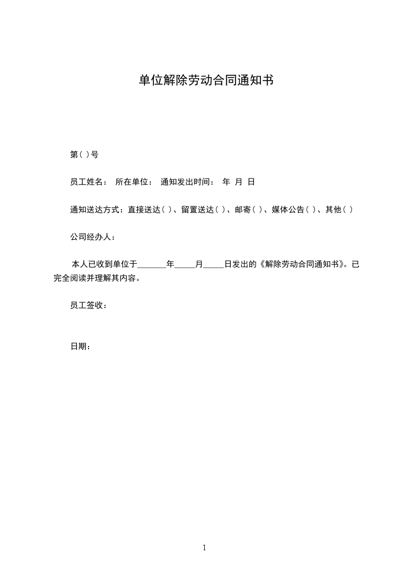 公司______年____月____日签收栏本人已收到上述终止劳动合同通知书。