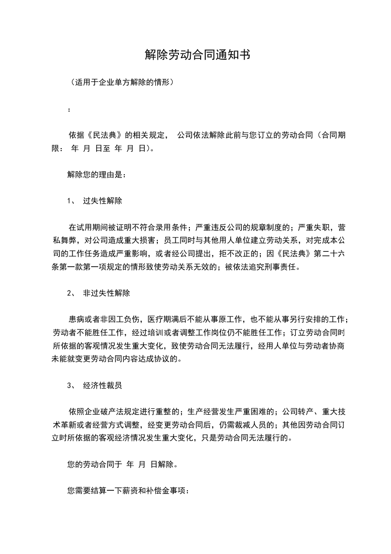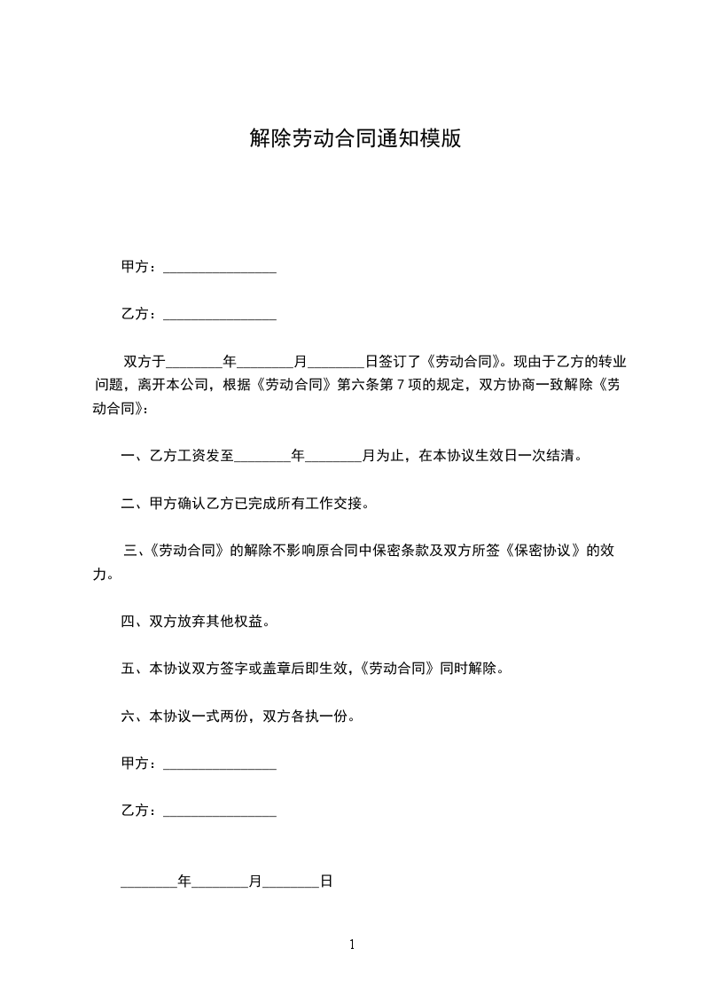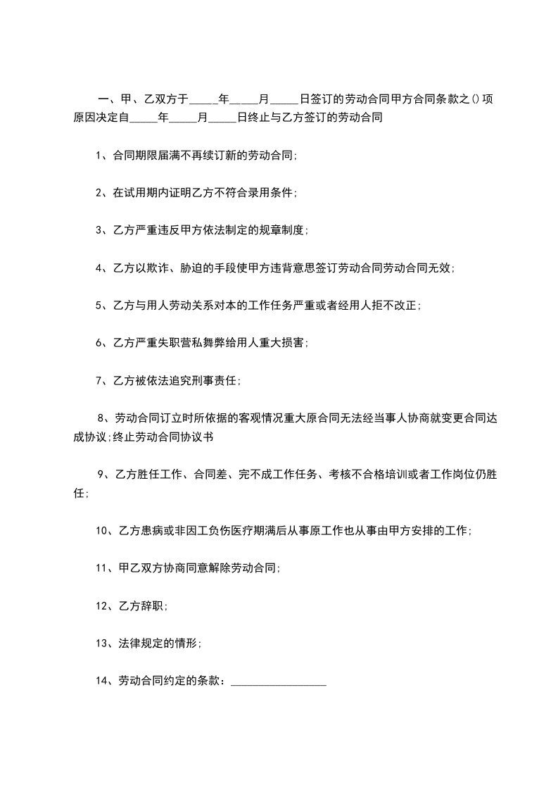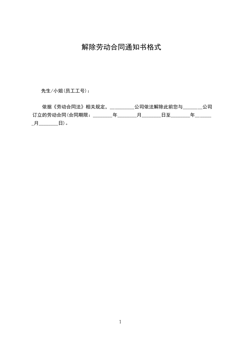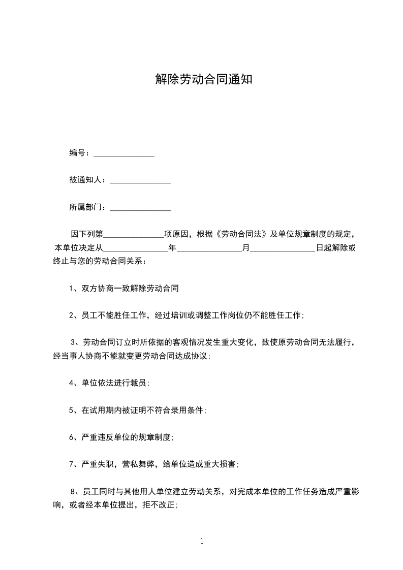 一、终止劳动合同通知