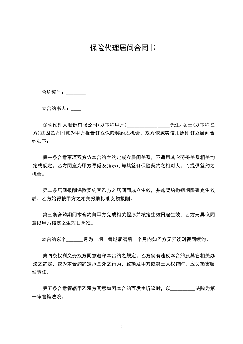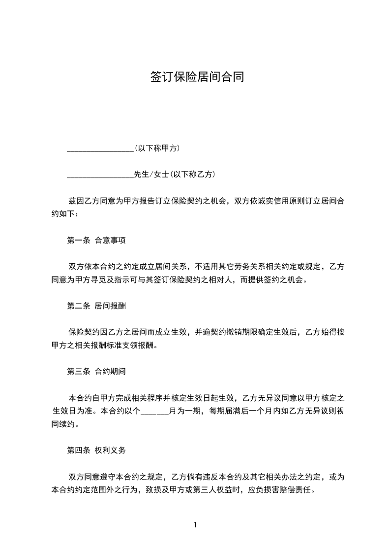 保险代理人股份有限公司(以下称甲方)_________________先生/女士(以下称乙方)兹因乙方同意为甲方报告订立保险契约之机会,双方依诚实信用原则订立居间合约如下: