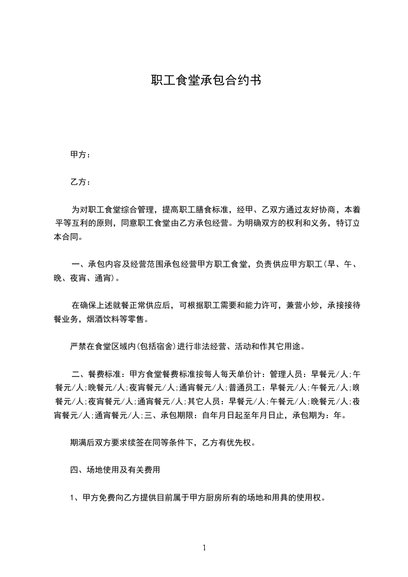 二、餐费标准:甲方食堂餐费标准按每人每天单价计:管理人员:早餐元/人;午餐元/人;晚餐元/人;夜宵餐元/人;通宵餐元/人;普通员工:早餐元/人;午餐元/人;晚餐元/人;夜宵餐元/人;通宵餐元/人;其它人员:早餐元/人;午餐元/人;晚餐元/人;夜宵餐元/人;通宵餐元/人;三、承包期限:自_____年_____月_____日起至_____年_____月_____日止,承包期为:年。