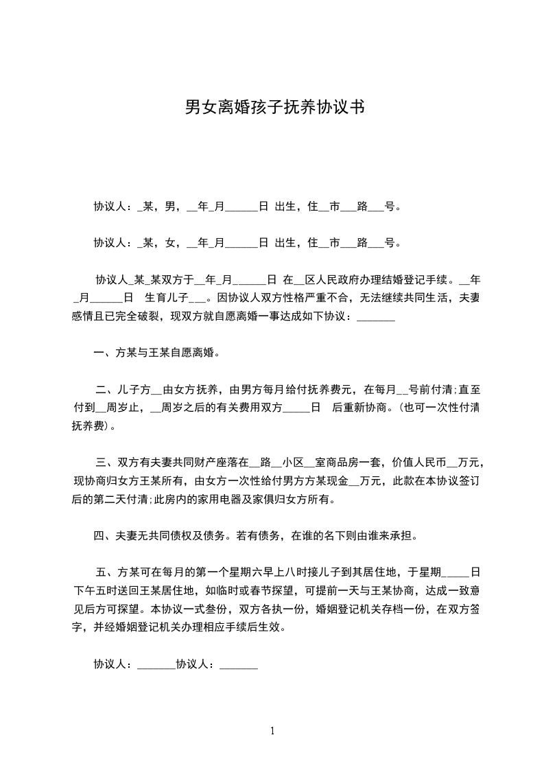 二、儿子/女儿_______取名_______,离婚后由_______男方/女方抚养,由_______女方/男方每月给付抚养费_______元,在每月