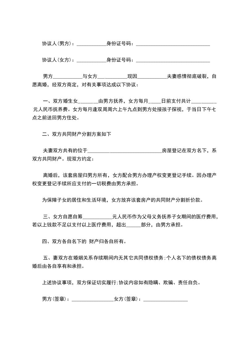 五、本协议一式三份,双方各执一份,婚姻登记机关存档一份,双方签字,并经婚姻登记机关办理离婚手续后生效。