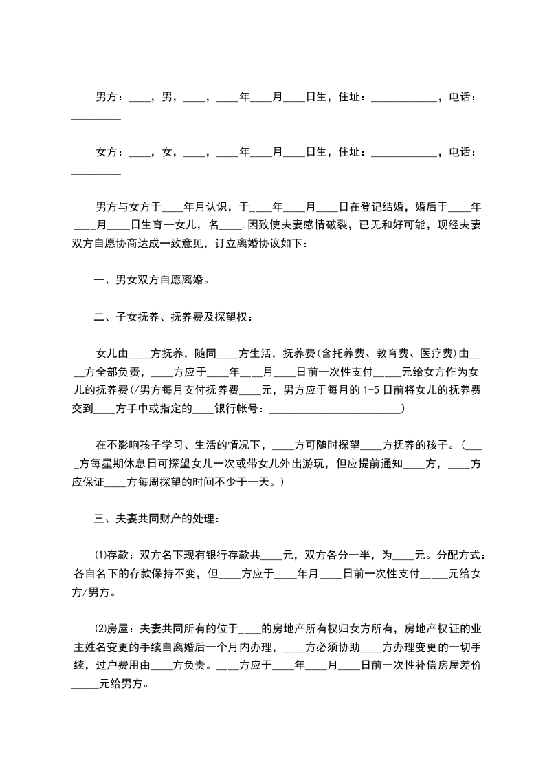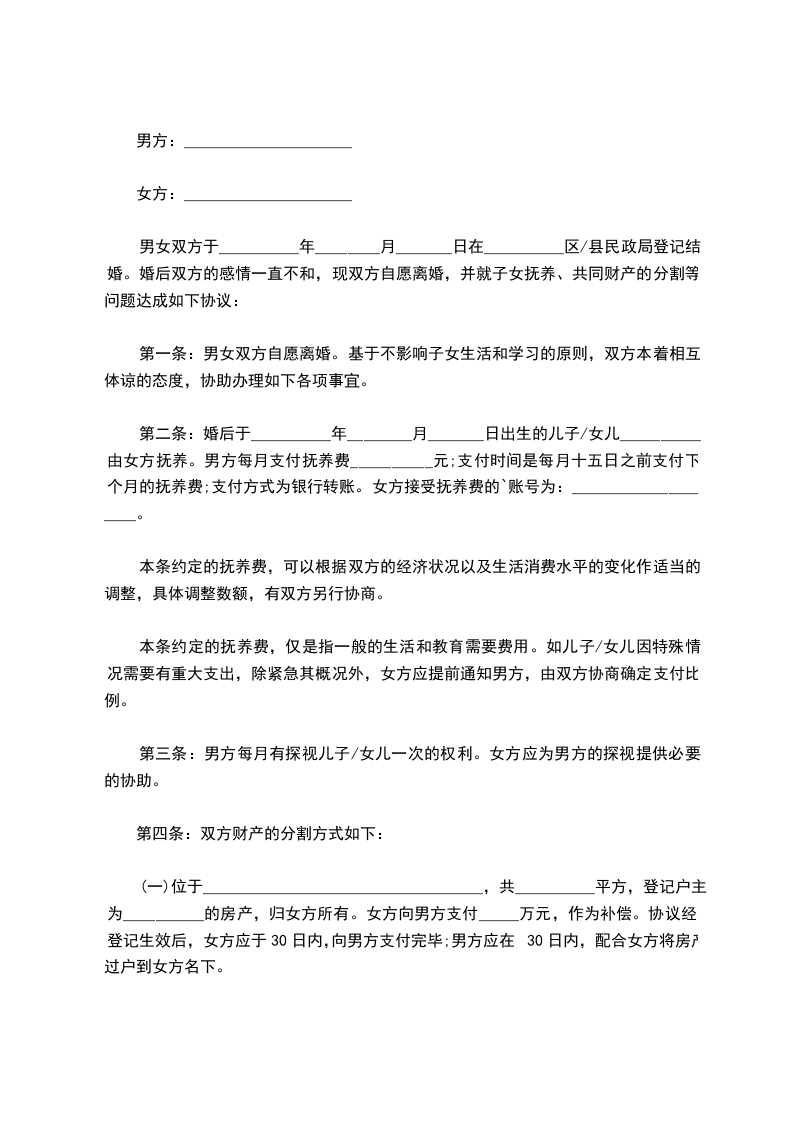一、男方与女方自愿离婚。