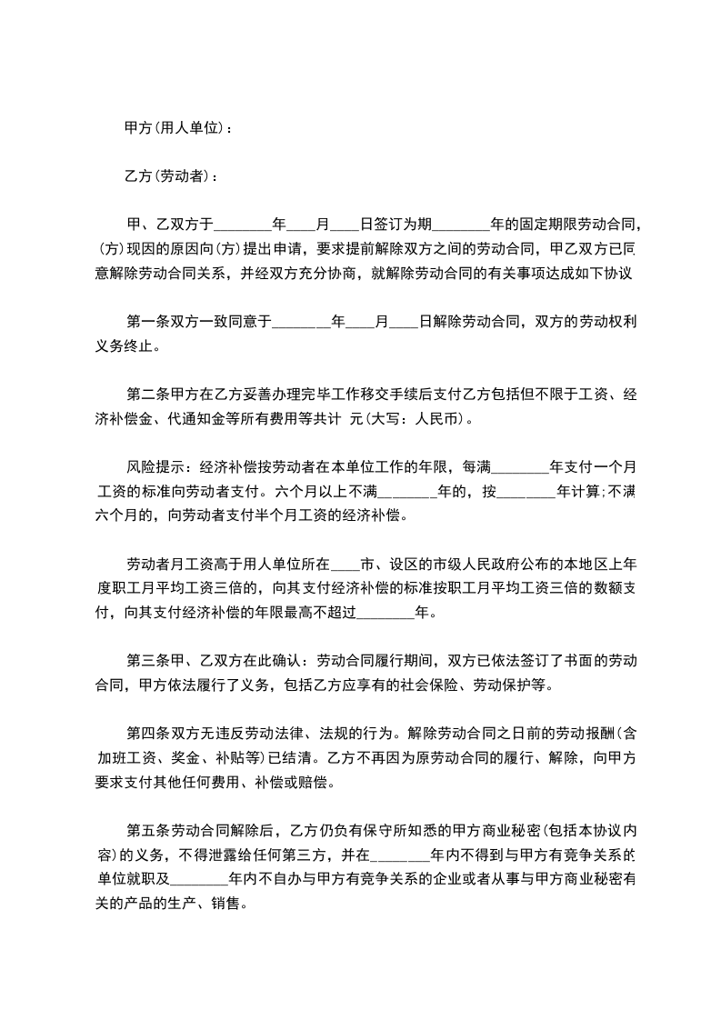 甲、乙双方于________年____月____日签订为期________年的固定期限劳动合同,(方)现因的原因向(方)提出申请,要求提前解除双方之间的劳动合同,甲乙双方已同意解除劳动合同关系,并经双方充分协商,就解除劳动合同的有关事项达成如下协议:
