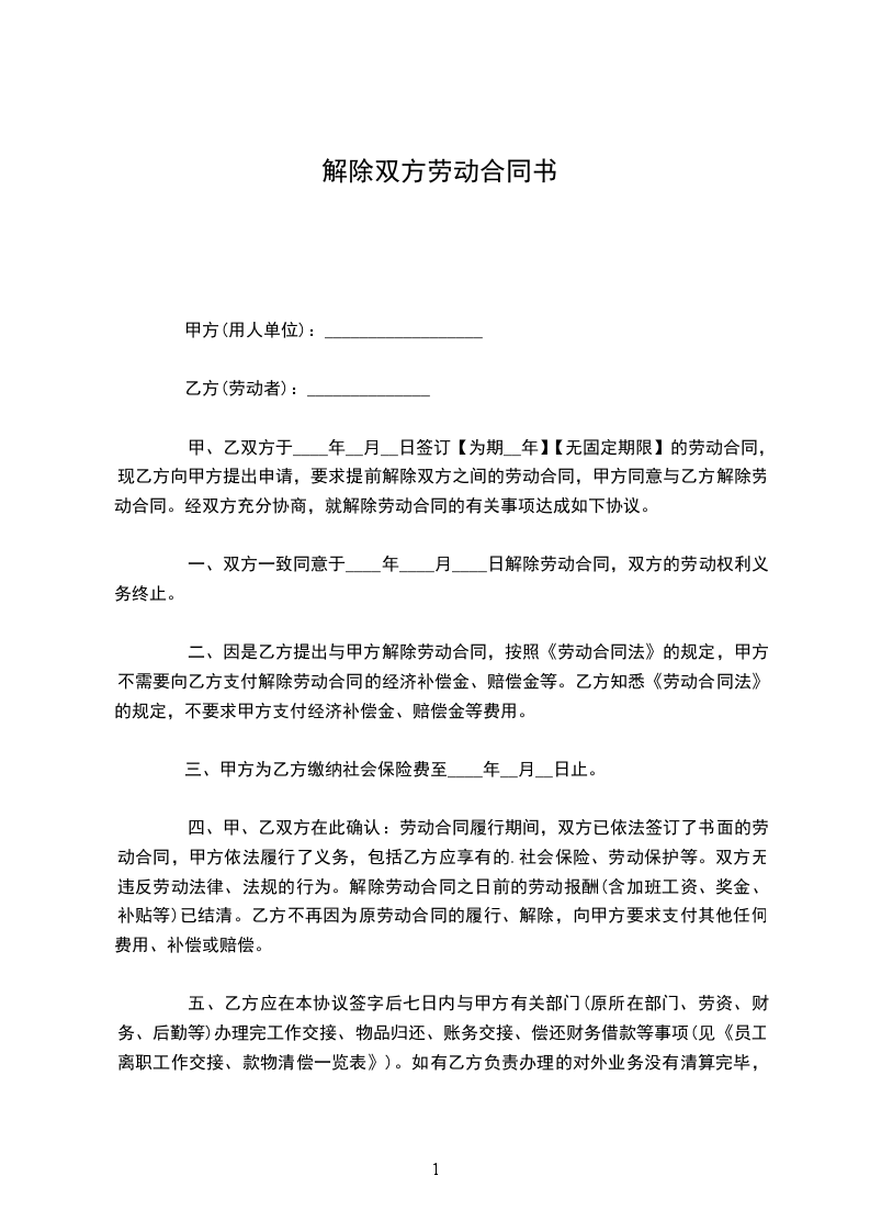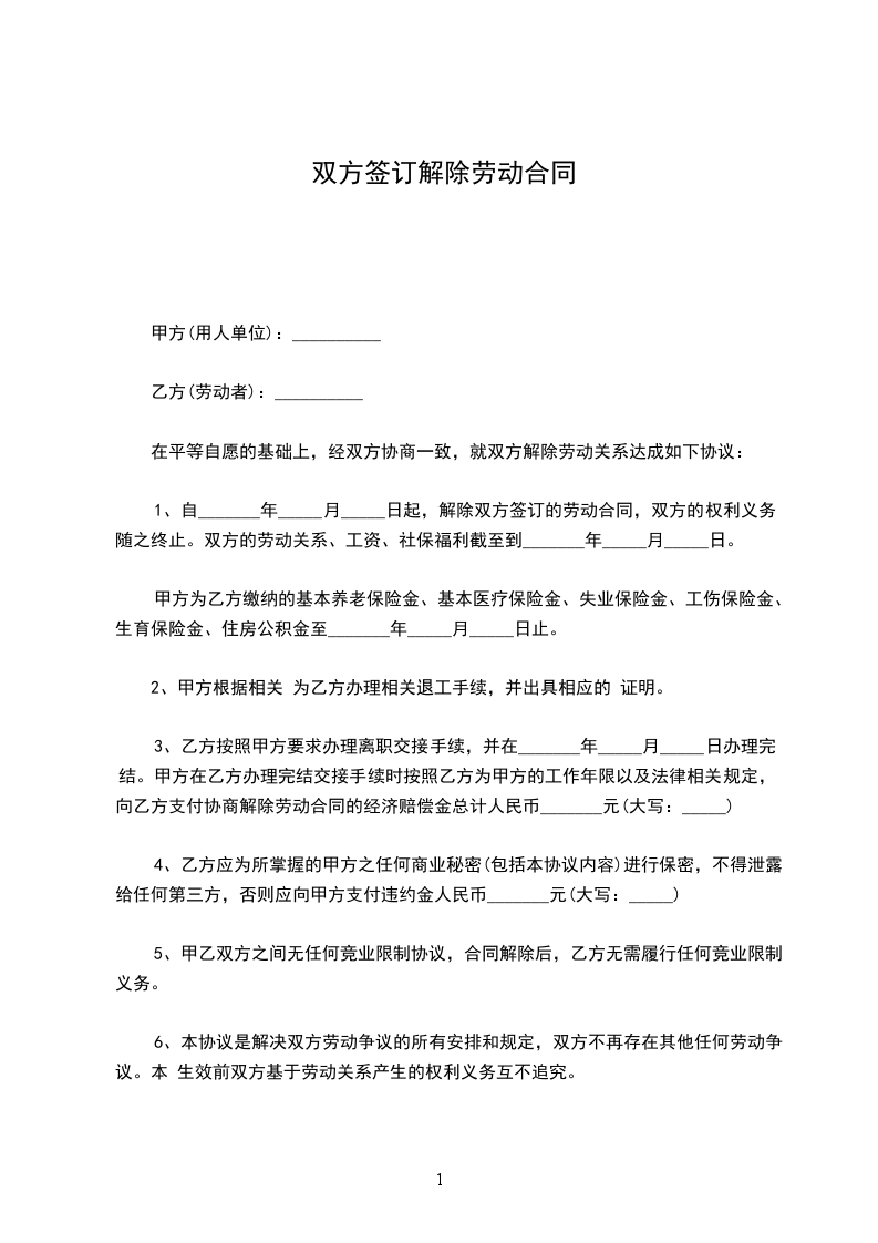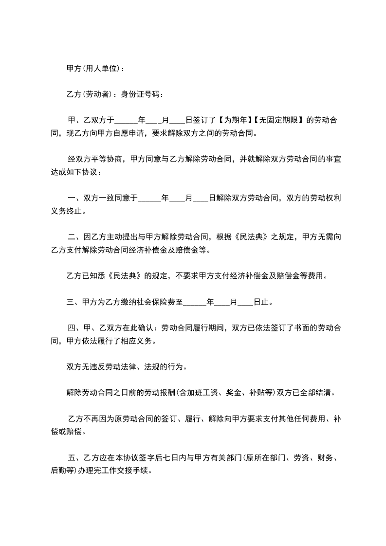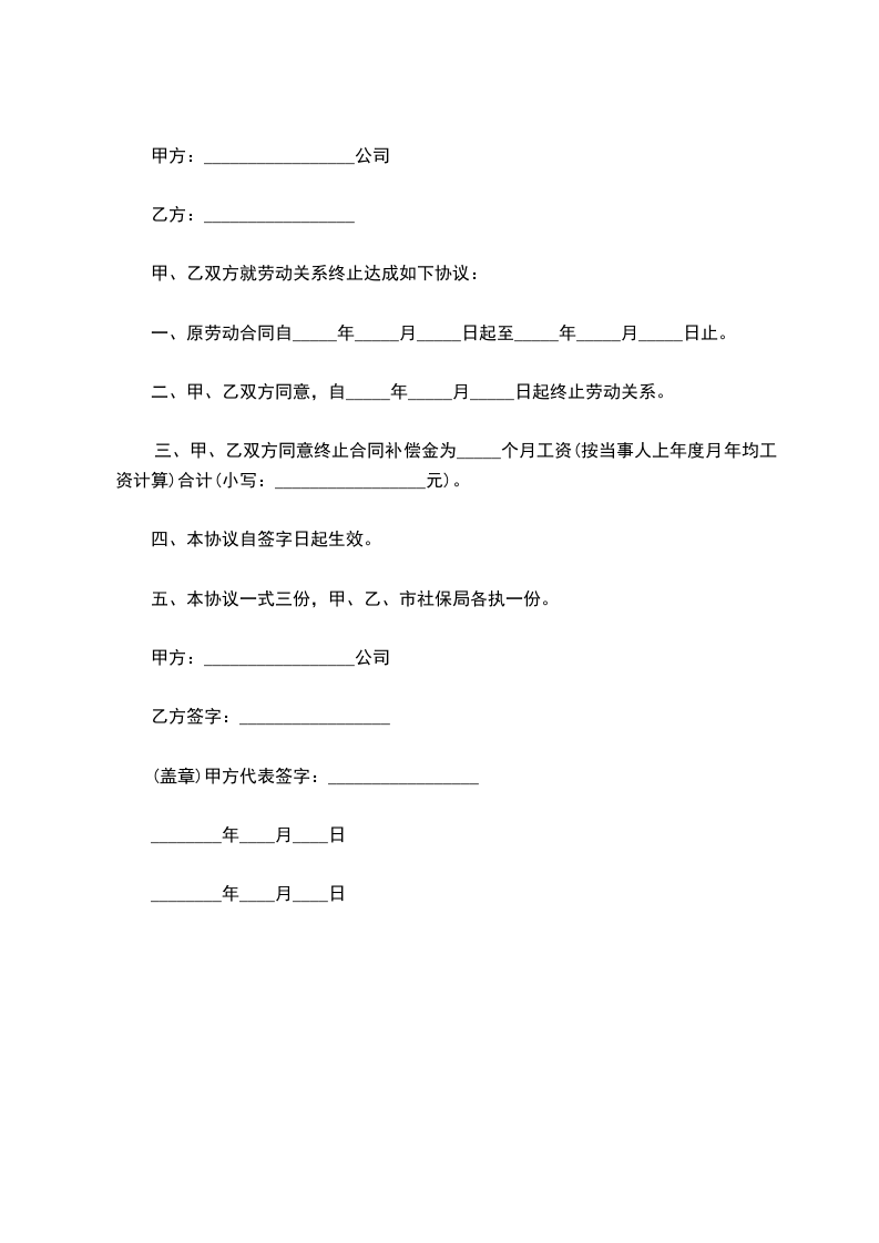 二、甲、乙双方同意,自_____年_____月_____日起终止劳动关系。