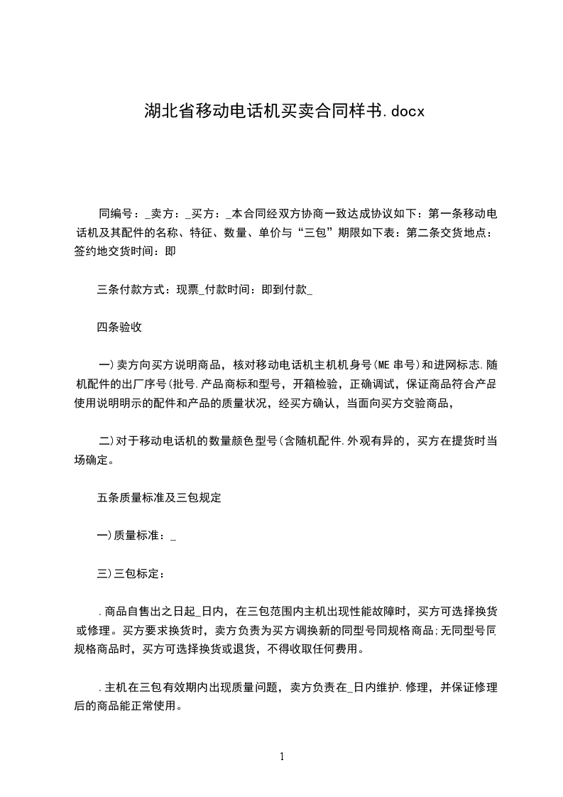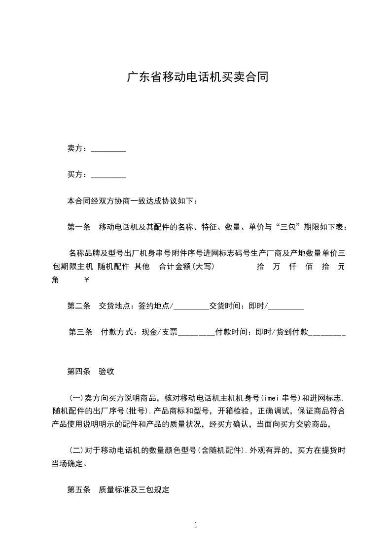 第一条 移动电话机及其配件的名称、特征、数量、单价与“三包”期限如下表: