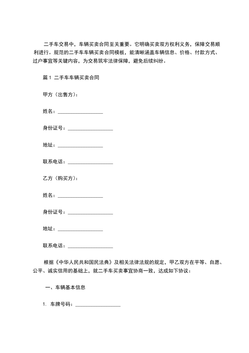 根据《中华人民共和国民法典》及相关法律法规的规定,甲乙双方在平等、自愿、公平、诚实信用的基础上,就乙方购买甲方出售的二手车事宜,经协商一致,达成如下协议: