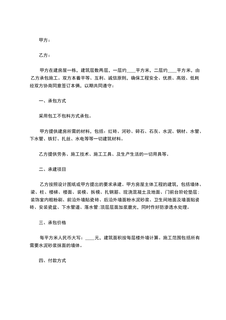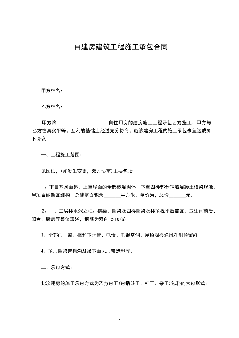 根据《中华人民共和国民法典》及相关法律法规的规定,甲乙双方在平等、自愿、公平、诚实信用的基础上,就甲方自建房工程承包事宜达成如下协议: