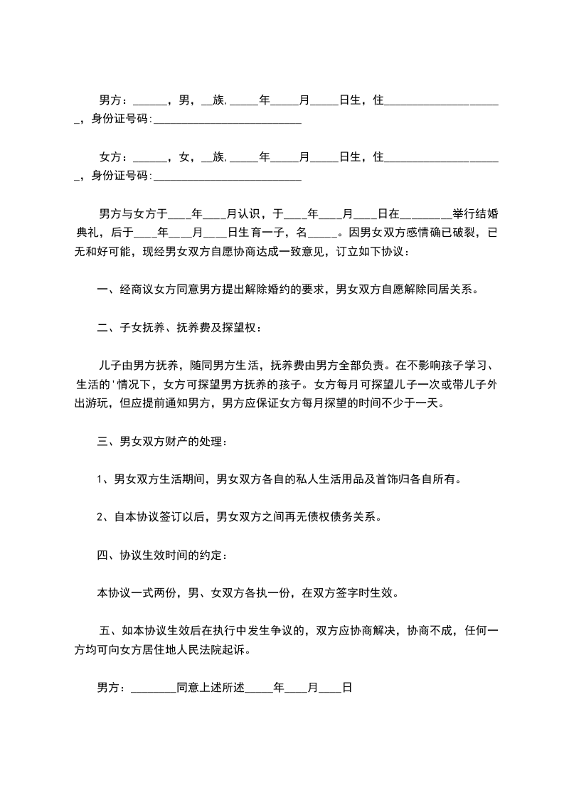 五、方 可在每月的第一个星期六早上八时接儿子到其居住地,于星期日下午五时送回王 居住地,如临时或春节探望,可提前一天与王 协商,达成一致意见后方可探望。