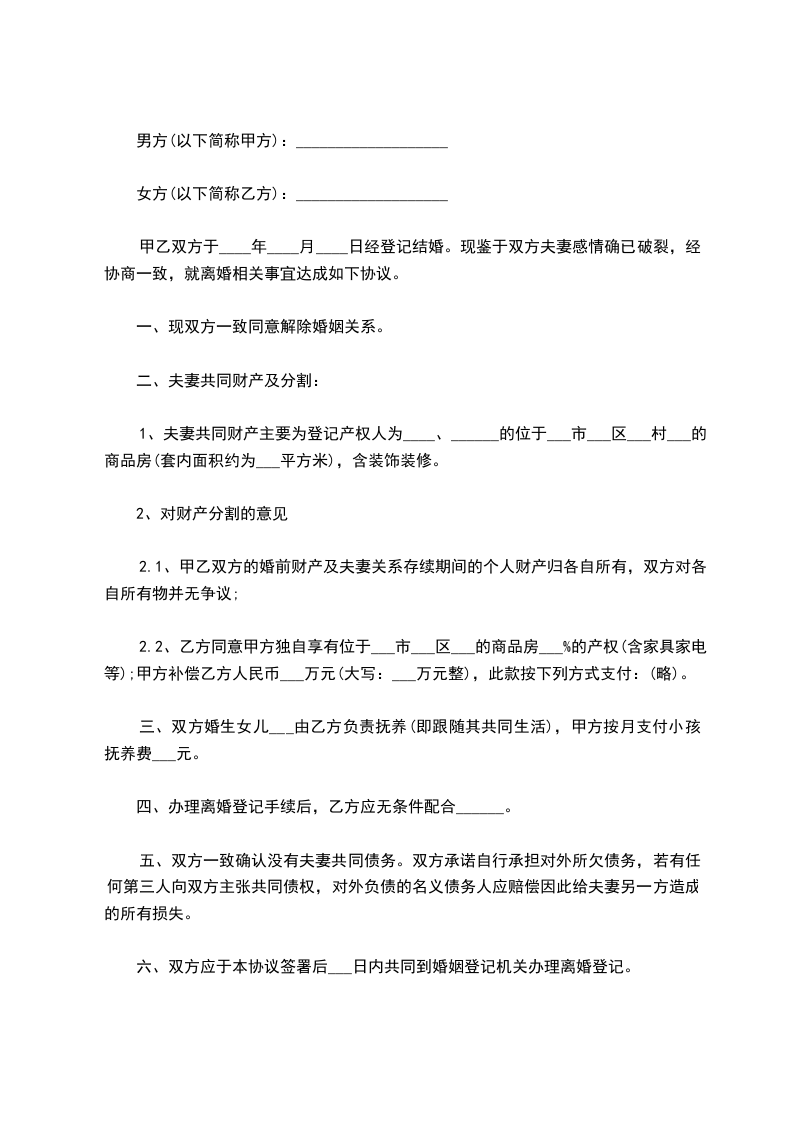 三、双方有夫妻共同财产座落在__________路__________小区__________室商品房一套,价值人民币80万元,现协商归女方________所有,由女方一次性给付男方方 现金________万元,此款在本协议签订后的第二天付清;此房内的家用电器及家俱归女方所有。