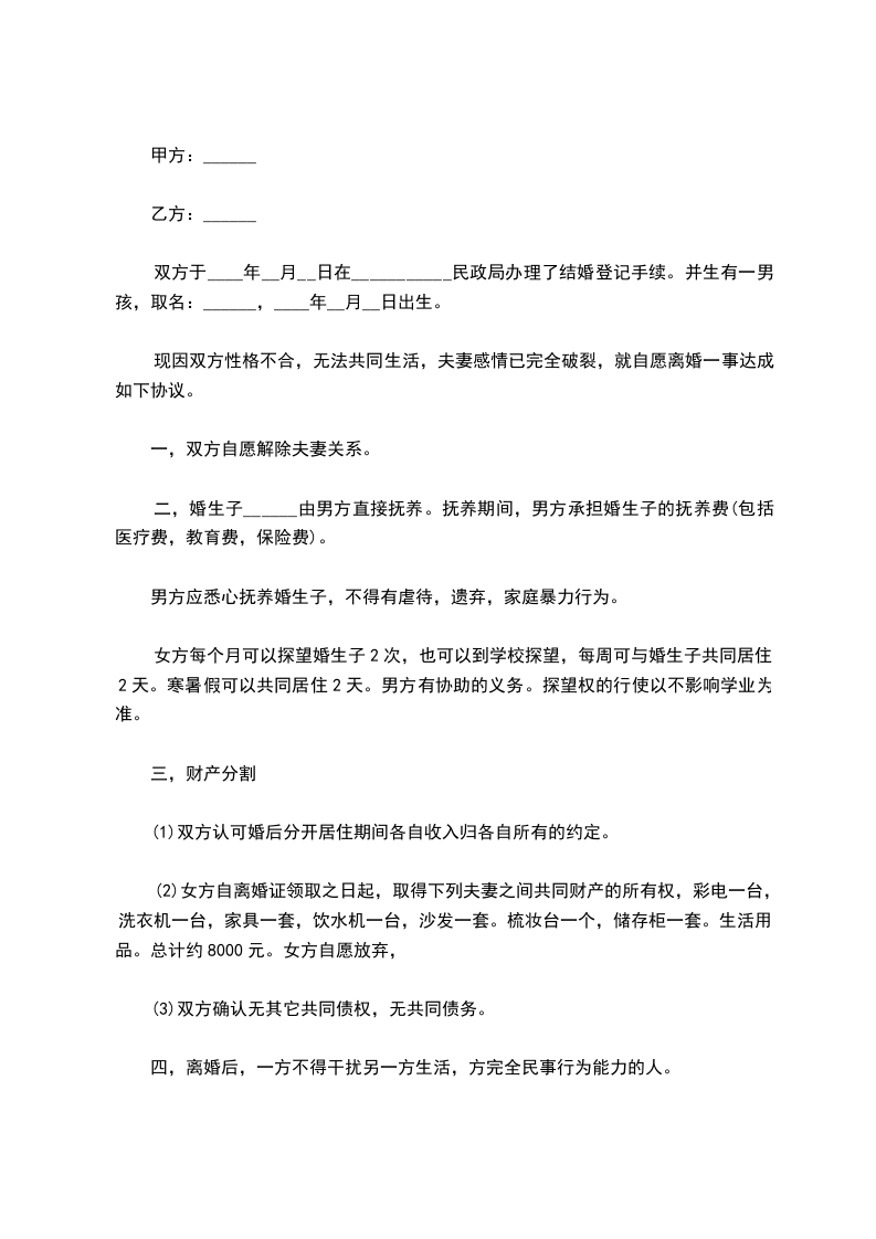 因协议人双方性格严重不合,无法继续共同生活,夫妻感情且已完全破裂,现双方就自愿离婚一事达成如下协议: