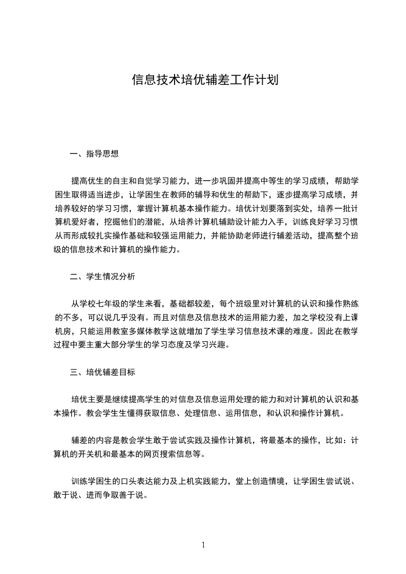 信息技术培优补差工作计划旨在提升学生在信息技术领域的水平,针对学有余力和学习有困难的学生分别制定策略。通过分层教学、个别辅导等方式,激发学生学习兴趣,弥补知识漏洞,提高整体信息技术素养,促进学生全面发展。
