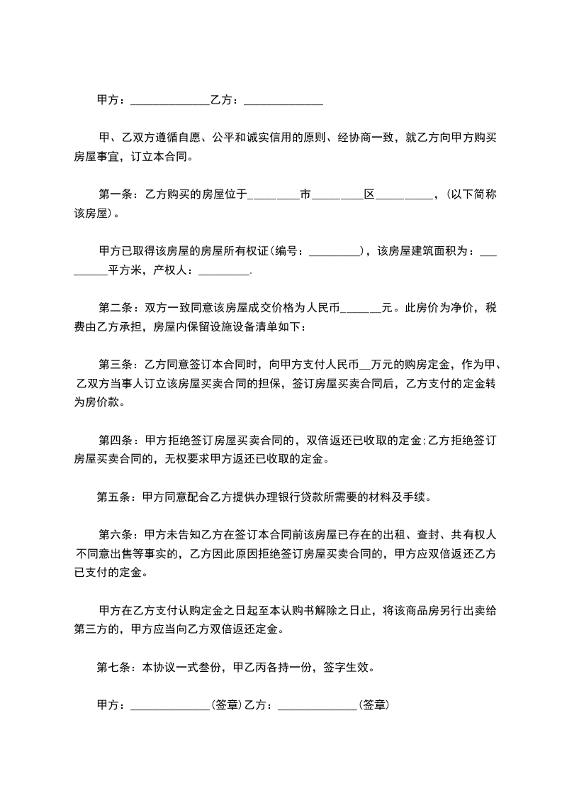 第二条:双方一致同意该房屋成交价格为人民币_______元。此房价为净价,税费由乙方承担,房屋内保留设施设备清单如下: