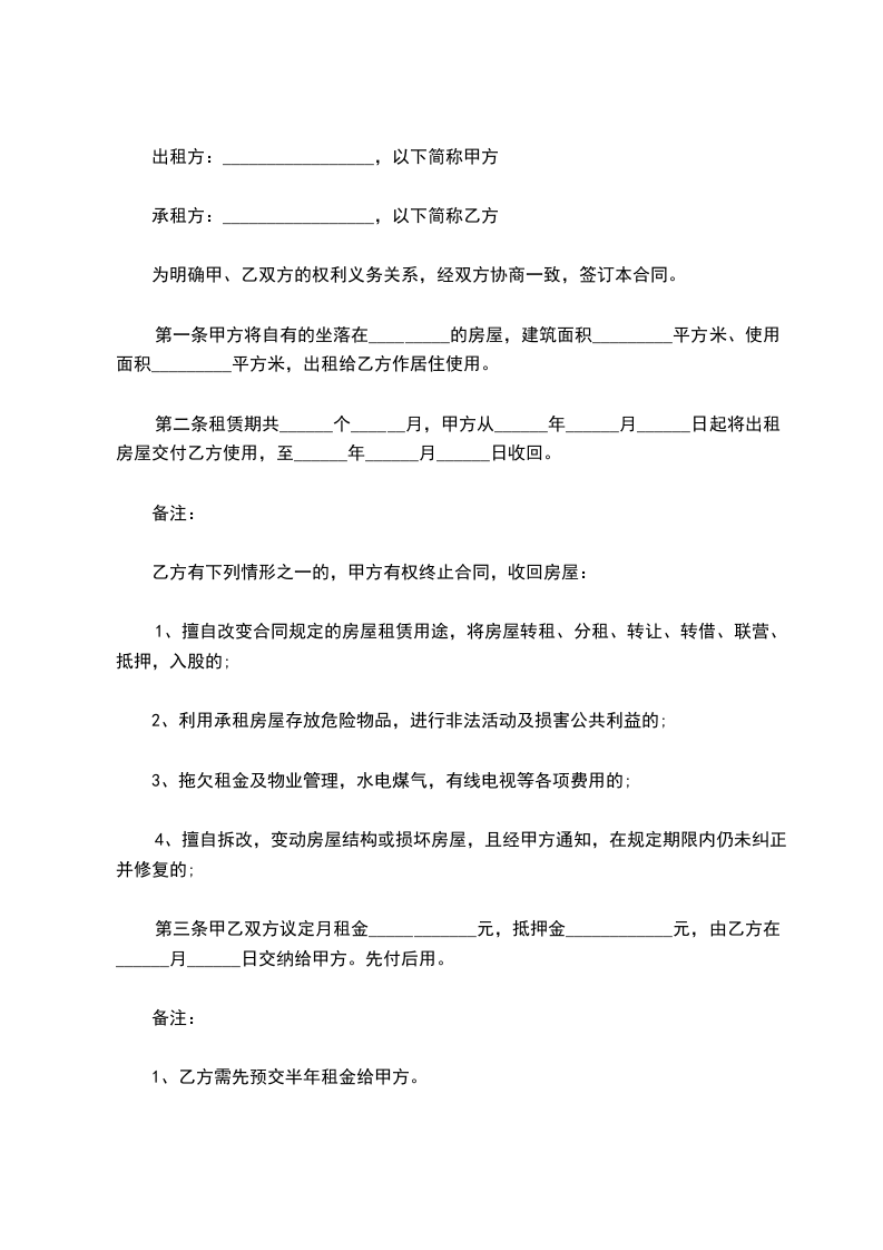 1. 乙方租赁该房屋仅作为______(具体用途,如居住、办公等)使用,未经甲方书面同意,乙方不得擅自改变房屋用途。