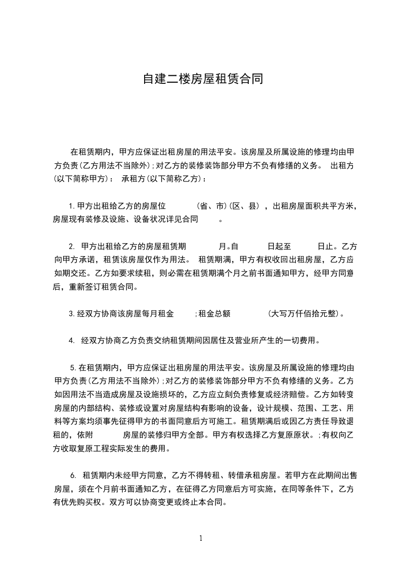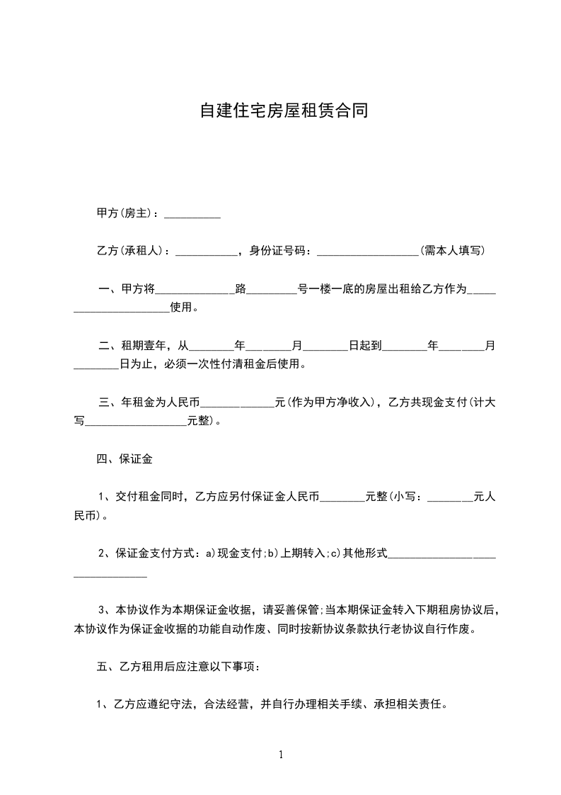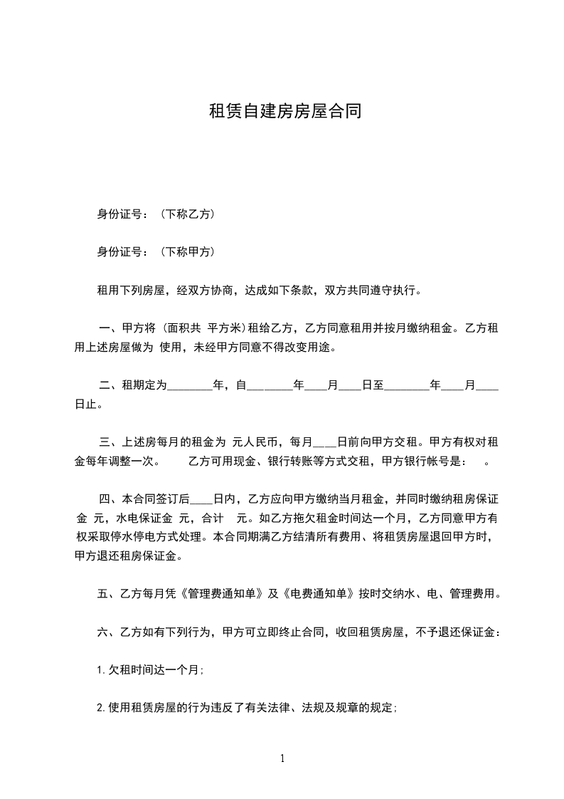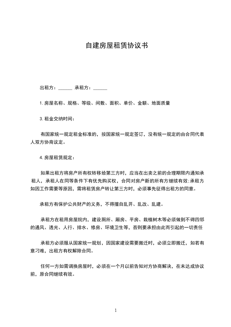 根据《中华人民共和国民法典》及相关法律法规的规定,甲乙双方在平等、自愿、公平、诚实信用的基础上,就甲方将其自建房屋出租给乙方使用事宜,达成如下协议: