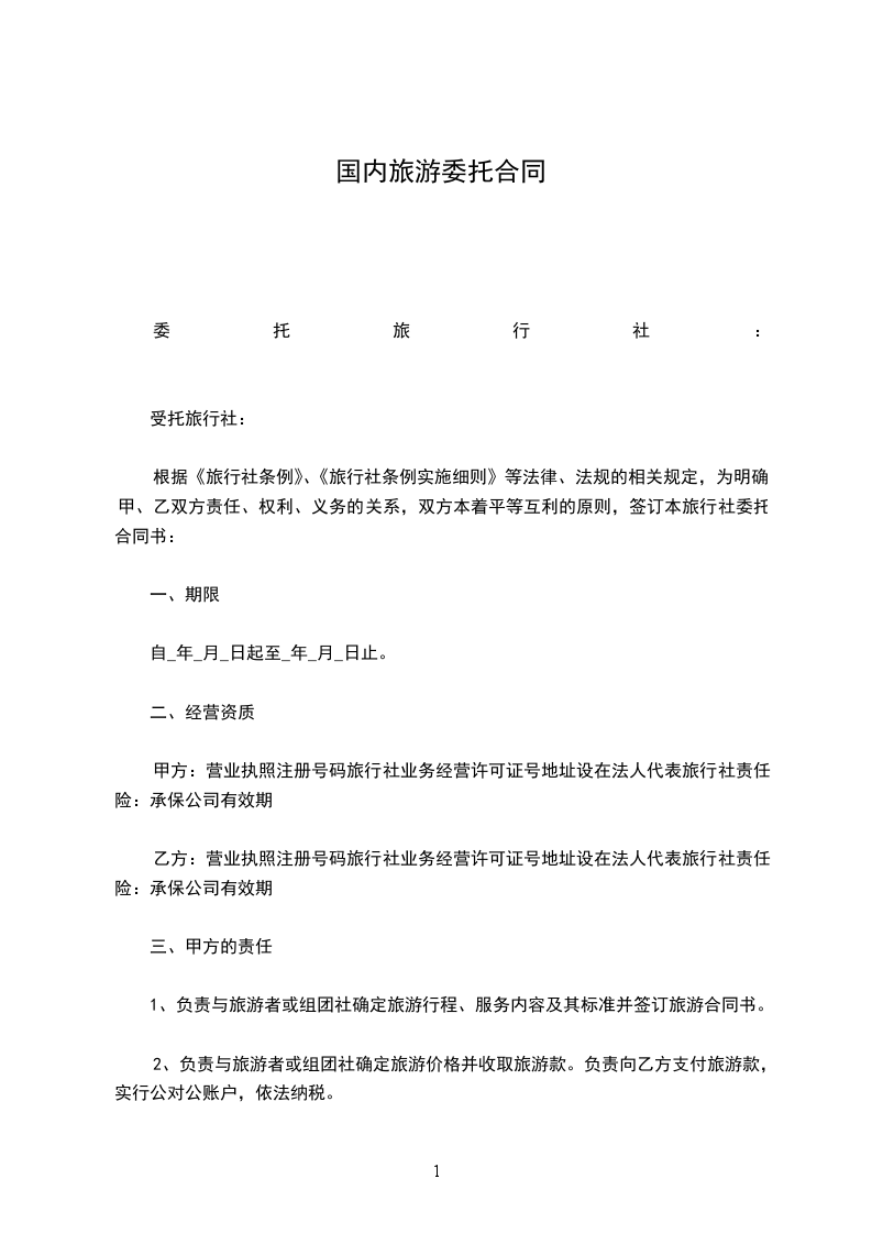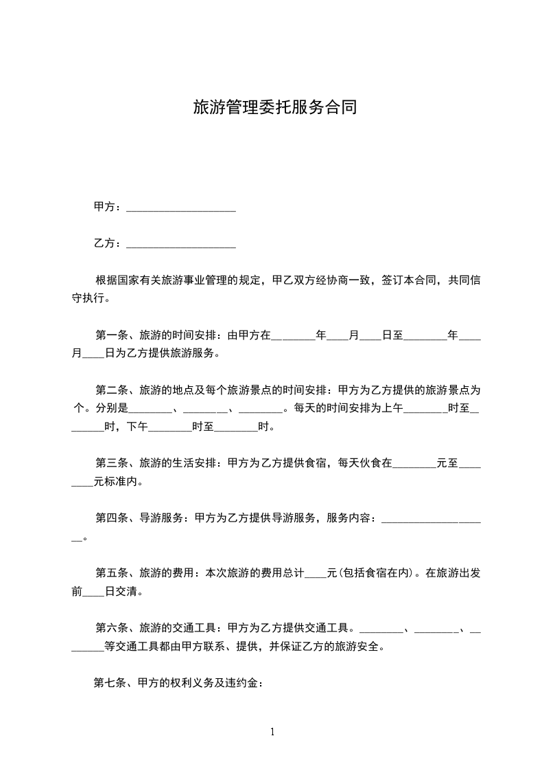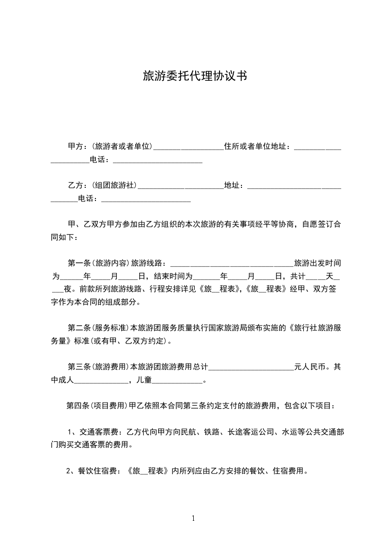 第一条(旅游内容)旅游线路:_______________________________旅游出发时间为______年_____月_____日,结束时间为_______年_____月_____日,共计_____天_____夜。前款所列旅游线路、行程安排详见《旅__程表》,《旅__程表》经甲、双方签字作为本合同的组成部分。