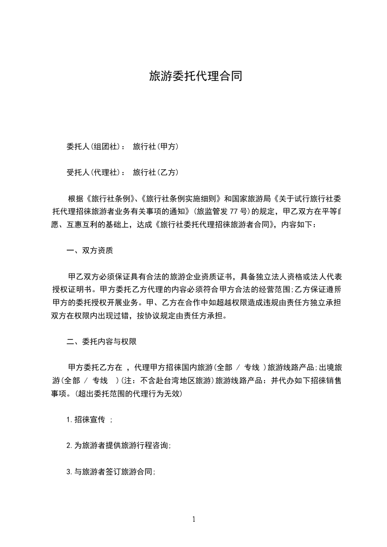 第二十条(委托招徕)乙方委托其他旅行社代为招徕时,不得以未直接收取甲方费用为由免责。