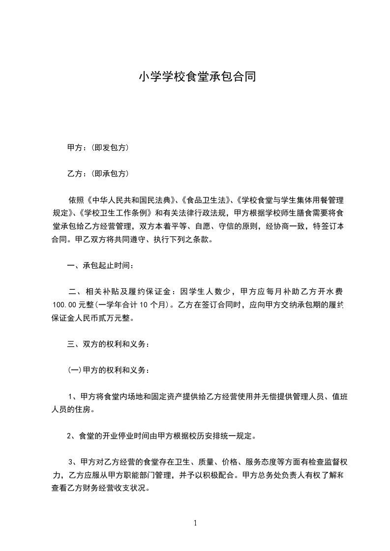 依照《中华人民共和国民法典》、《食品卫生法》、《学校食堂与学生集体用餐管理规定》、《学校卫生工作条例》和有关法律行政法规,甲方根据学校师生膳食需要将食堂承包给乙方经营管理,双方本着平等、自愿、守信的原则,经协商一致,特签订本合同。甲乙双方将共同遵守、执行下列之条款。