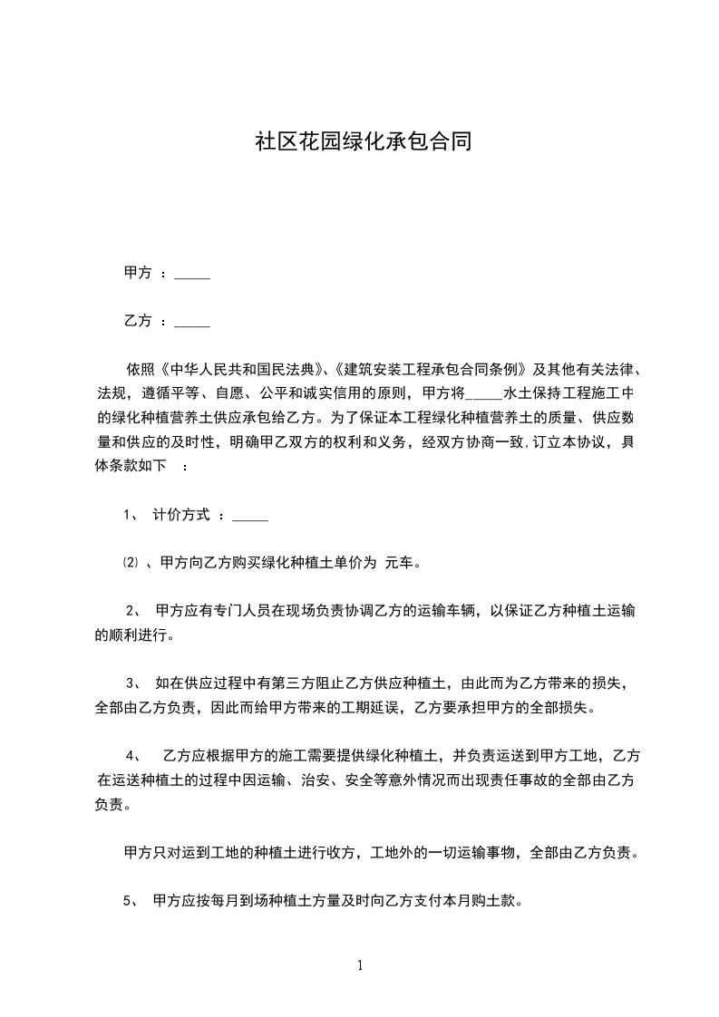 1、费用计算方法:、绿化养护费按平均_________元/年计算,绿化面积共_________,绿化养护承包总费用共计人民币_________元/年,季平均_________元。