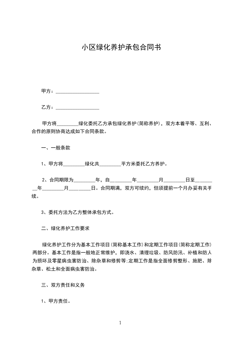 甲方将_________绿化委托乙方承包养护(简称养护),双方本着平等、互利、合作的原则协商达成如下合同条款。