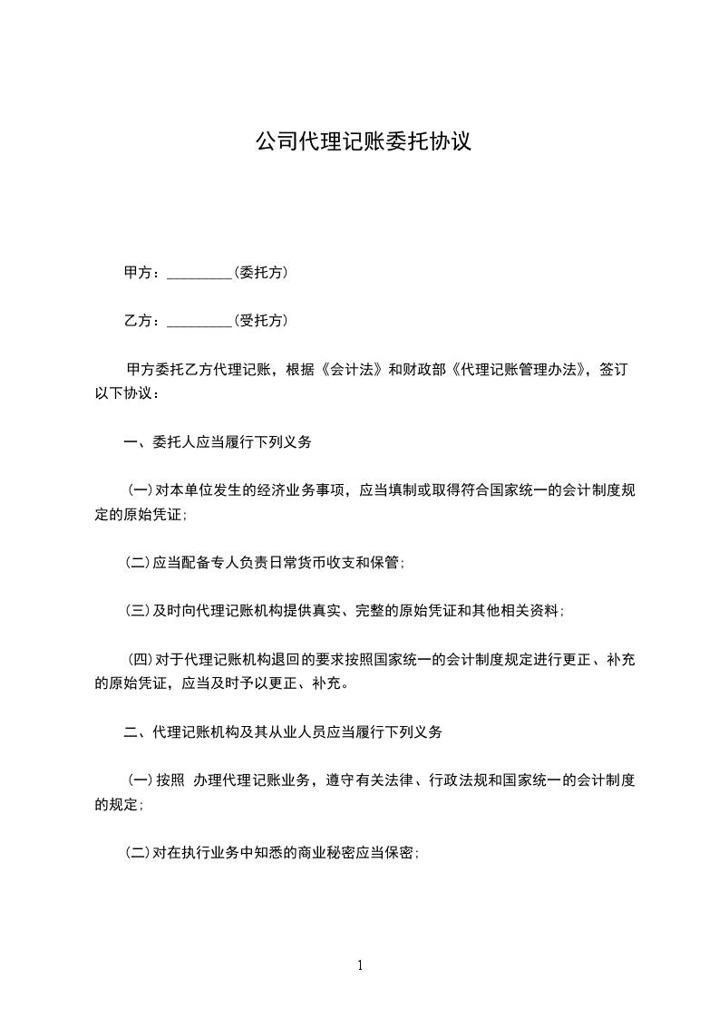 兹由甲方委托乙方代理记账,经双方代表协商,达成以下协议;