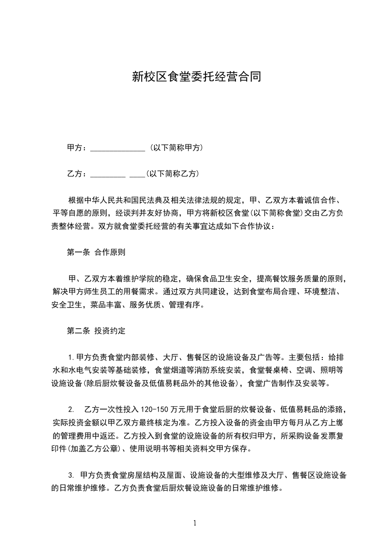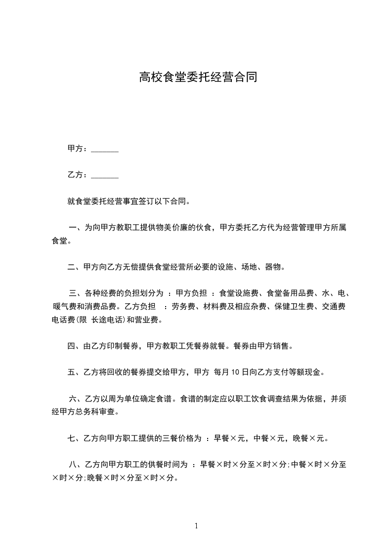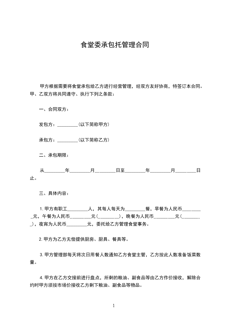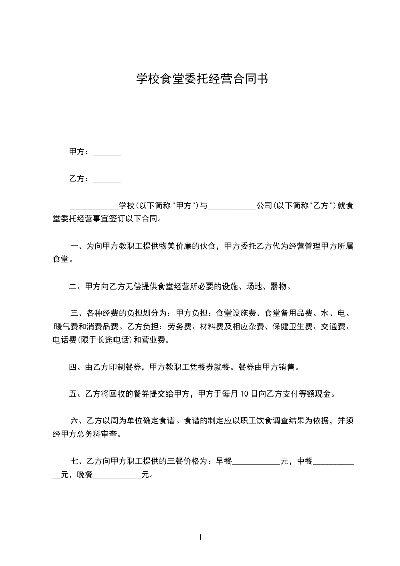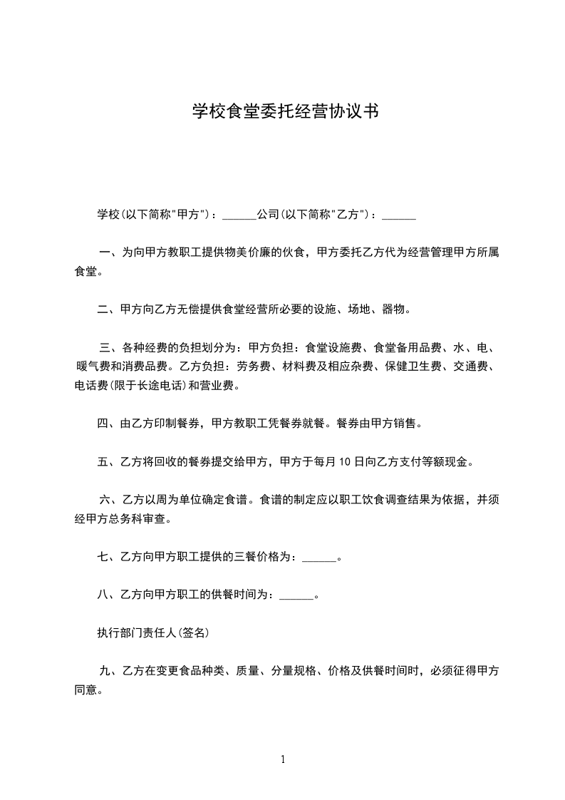 1、甲方将食堂内场地和固定资产提供给乙方经营使用并无偿提供管理人员、值班人员的住房。
