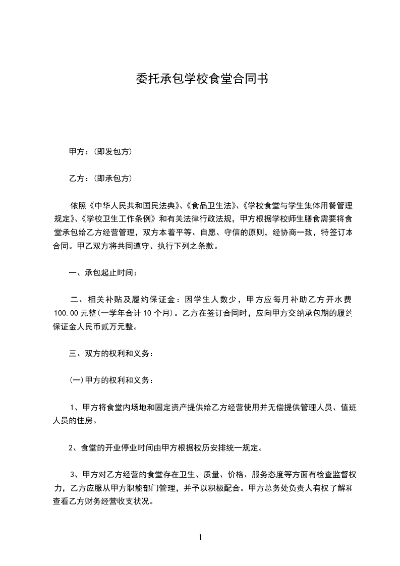 依照《中华人民共和国民法典》、《食品卫生法》、《学校食堂与学生集体用餐管理规定》、《学校卫生工作条例》和有关法律行政法规,甲方根据学校师生膳食需要将食堂承包给乙方经营管理,双方本着平等、自愿、守信的原则,经协商一致,特签订本合同。甲乙双方将共同遵守、执行下列之条款。