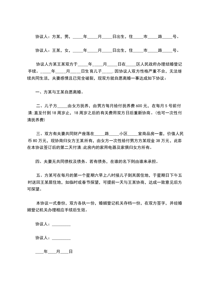 协议人方某王某双方于_____年_____月_____日在_____区人民政府办理结婚登记手续。_____年_____月_____日生育儿子_____.因协议人双方性格严重不合,无法继续共同生活,夫妻感情且已完全破裂,现双方就自愿离婚一事达成如下协议: