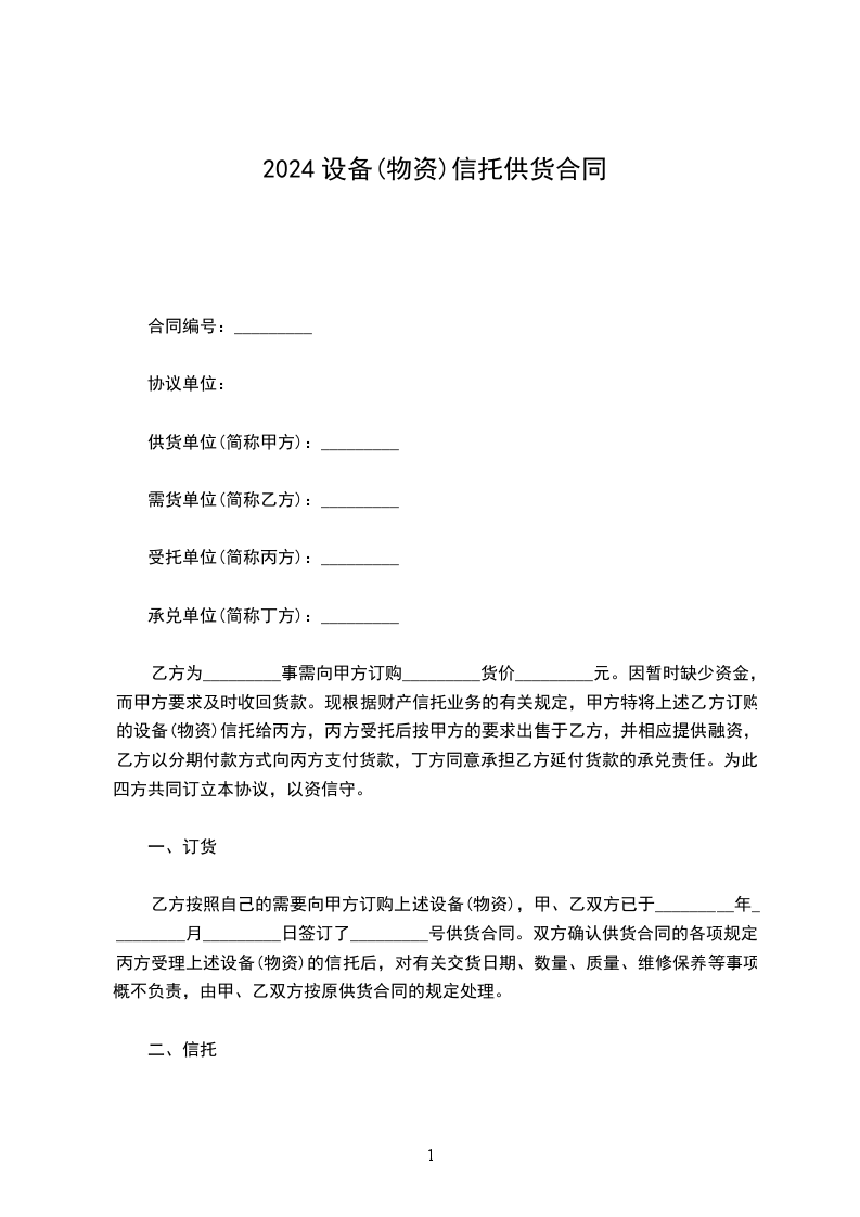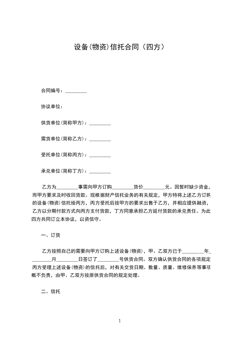 现根据财产信托业务的有关规定,甲方特将上述乙方订购的设备(物资)信托给丙方,丙方受托后按甲方的要求出售于乙方,并相应提供融资,乙方以分期付款方式向丙方支付货款,丁方同意承担乙方延付货款的承兑责任。为此,四方共同订立本协议,以资信守。