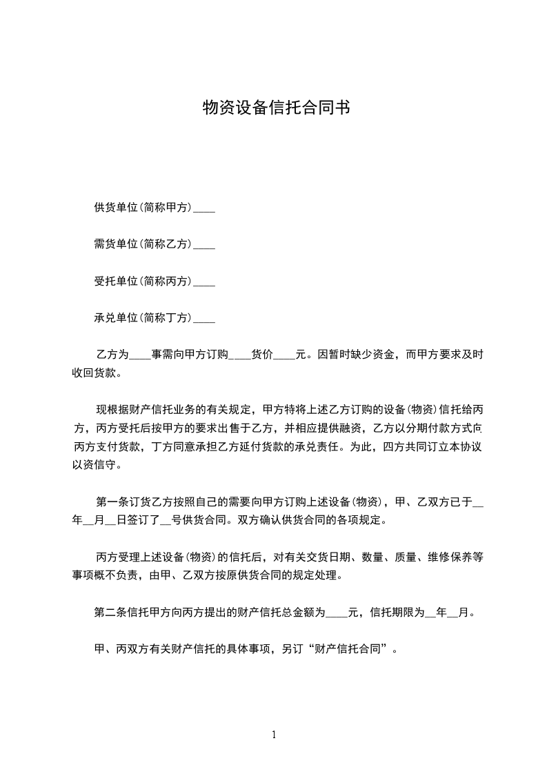 丙方受理上述设备(物资)的信托后,对有关交货日期、数量、质量、维修保养等事项概不负责,由甲、乙双方按原供货合同的规定处理。第二条信托甲方向丙方提出的财产信托总金额为____元,信托期限为__年__月。