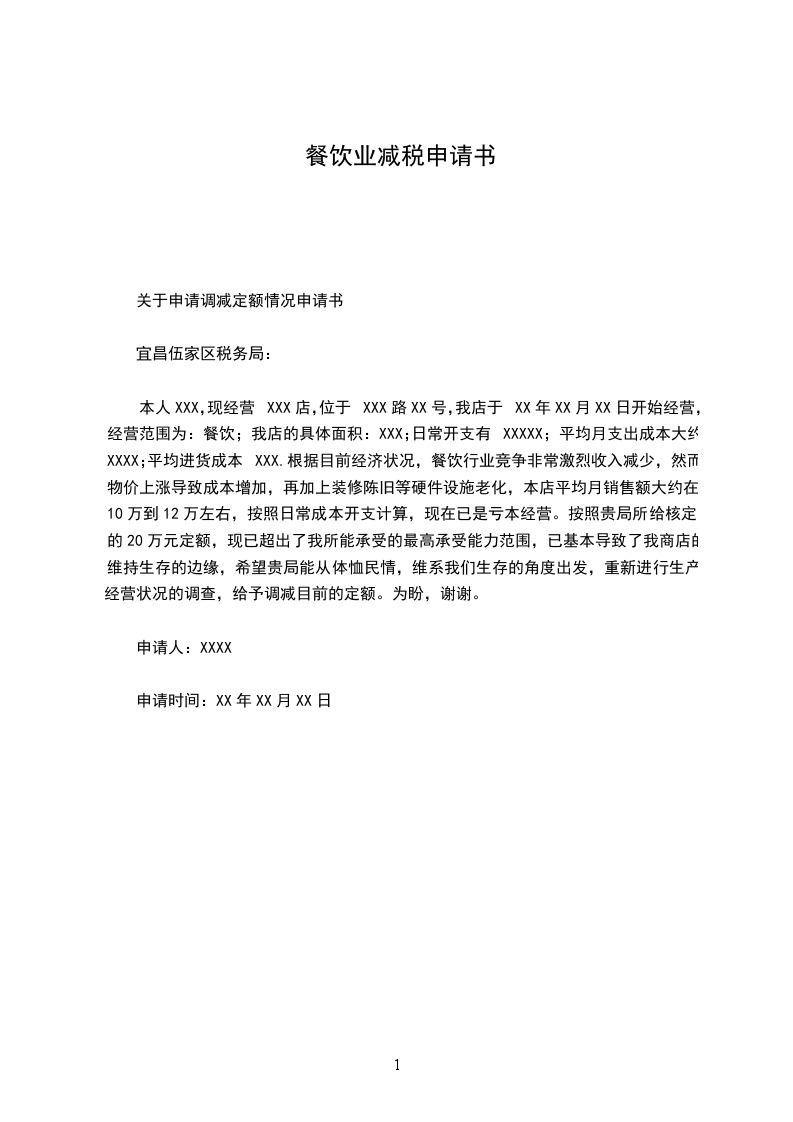本人XXX,现经营XXX店,位于XXX路XX号,我店于XX年XX月XX日开始经营,经营范围为:餐饮;我店的具体面积:XXX;日常开支有XXXXX;平均月支出成本大约XXXX;平均进货成本XXX.根据目前经济状况,餐饮行业竞争非常激烈收入减少,然而物价上涨导致成本增加,再加上装修陈旧等硬件设施老化,本店平均月销售额大约在10万到12万左右,按照日常成本开支计算,现在已是亏本经营。按照贵局所给核定的20万元定额,现已超出了我所能承受的最高承受能力范围,已基本导致了我商店的维持生存的边缘,希望贵局能从体恤民情,维系我们生存的角度出发,重新进行生产经营状况的调查,给予调减目前的定额。为盼,谢谢。