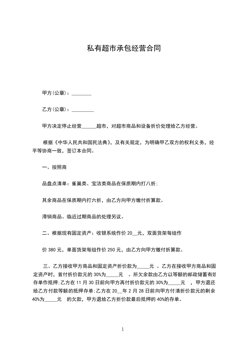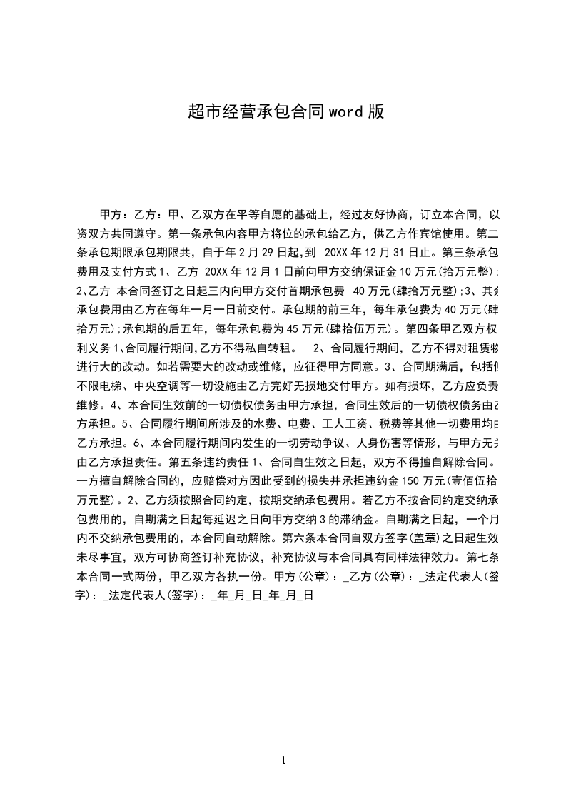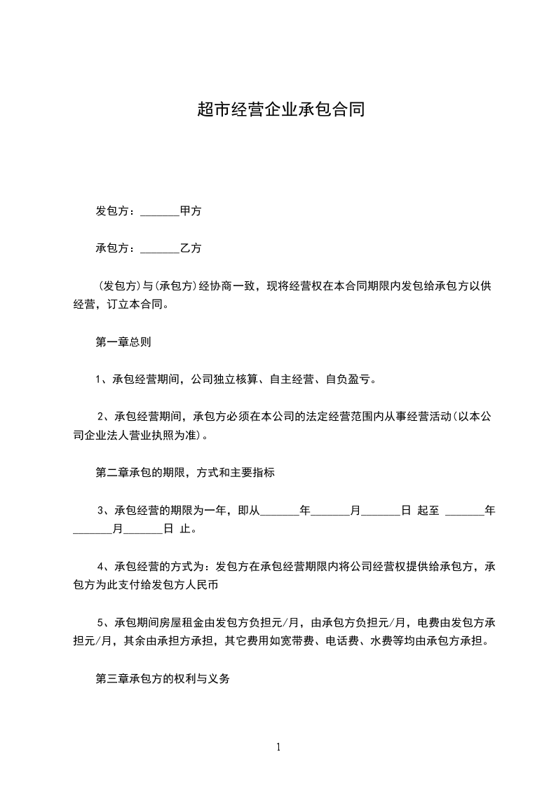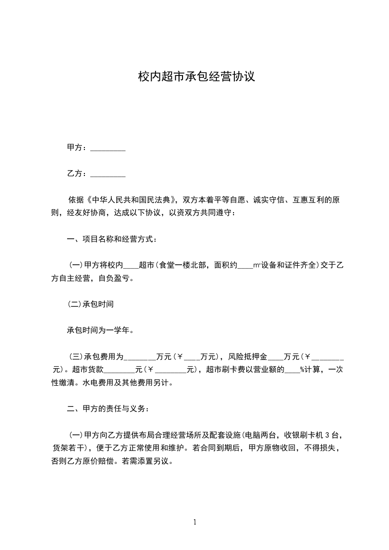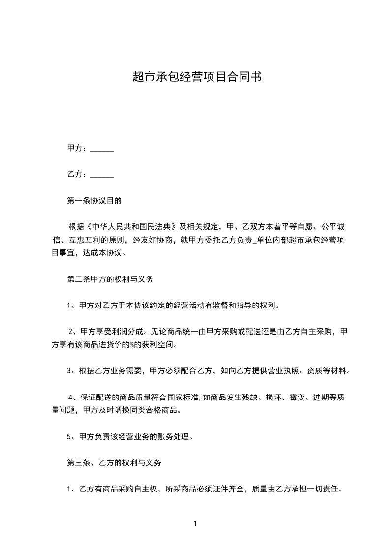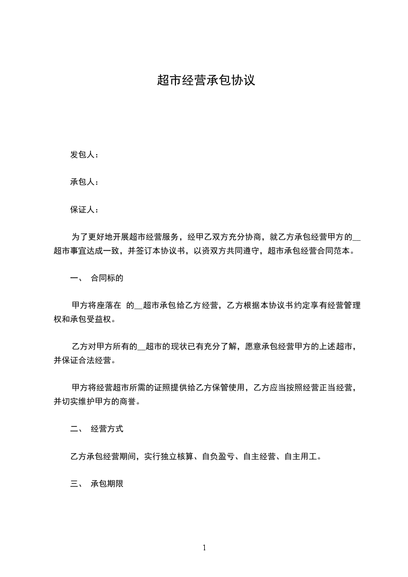 为了更好地开展超市经营服务,经甲乙双方充分协商,就乙方承包经营甲方的__超市事宜达成一致,并签订本协议书,以资双方共同遵守,