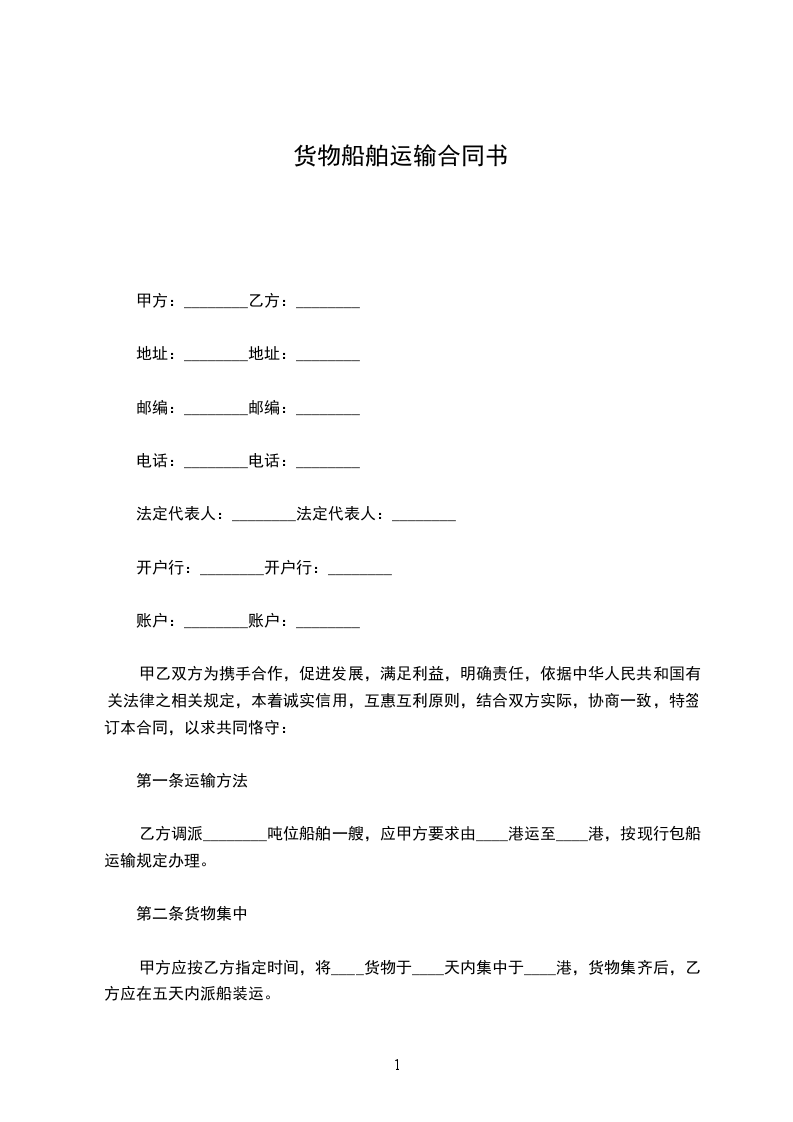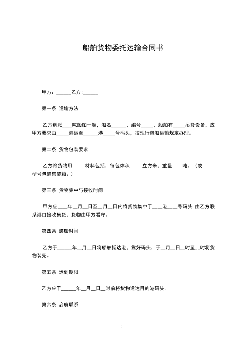 1.甲方未按时集中货物,造成乙方船舶不能按时装货、按时起航,每延误一小时应向乙方偿付违约金_________元。