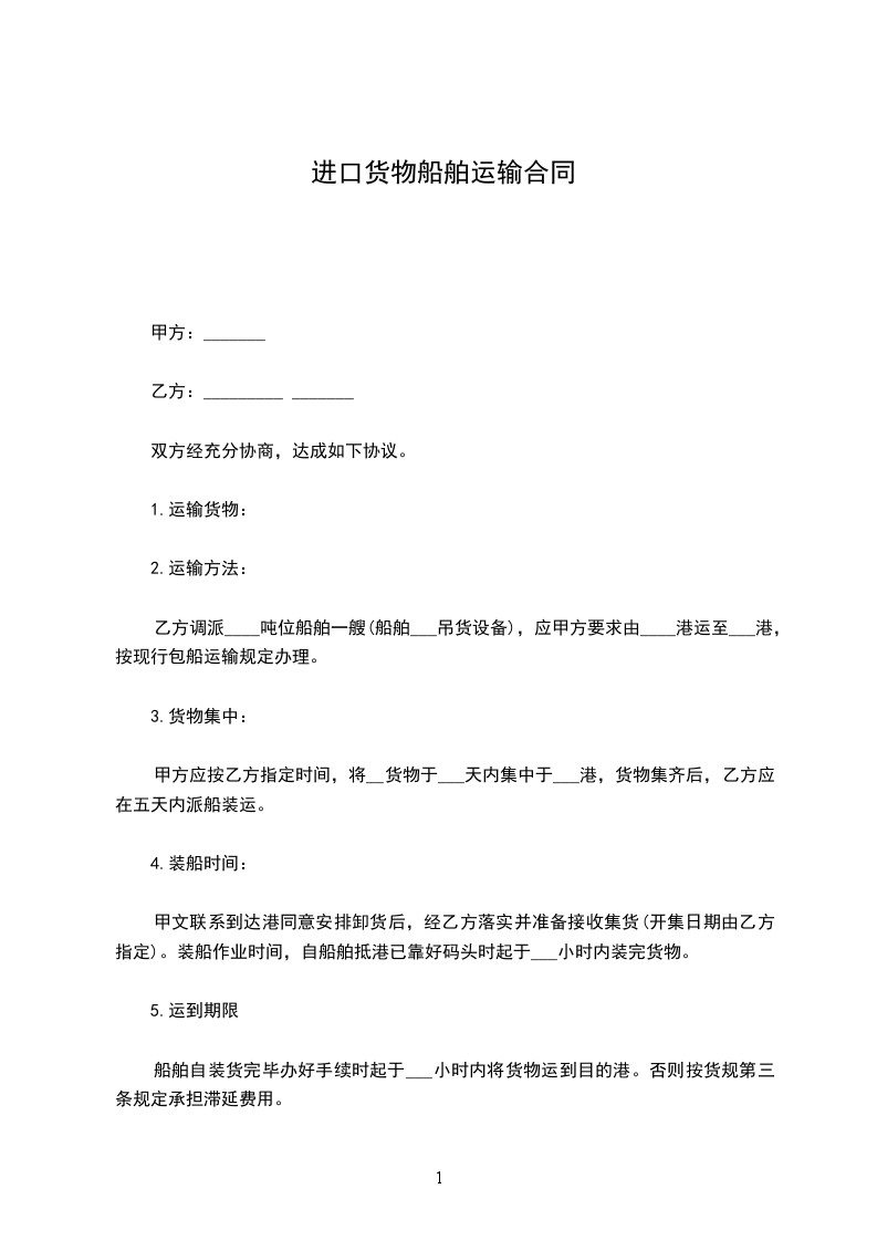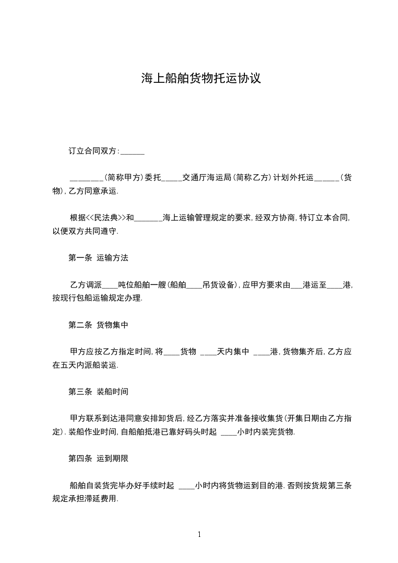 1.乙方未按期将货物运达目的港码头,每逾期一天,应偿付甲方违约金_________元。