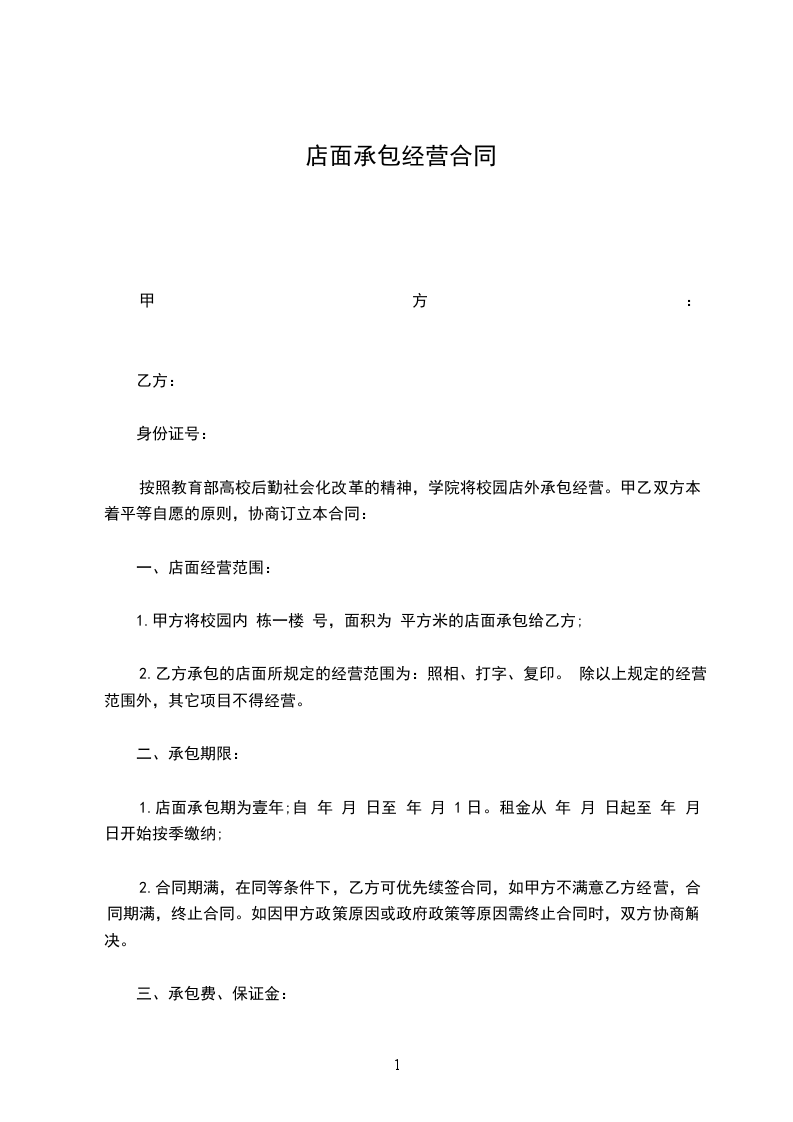1.甲方将校园内 栋一楼 号,面积为 平方米的店面承包给乙方;