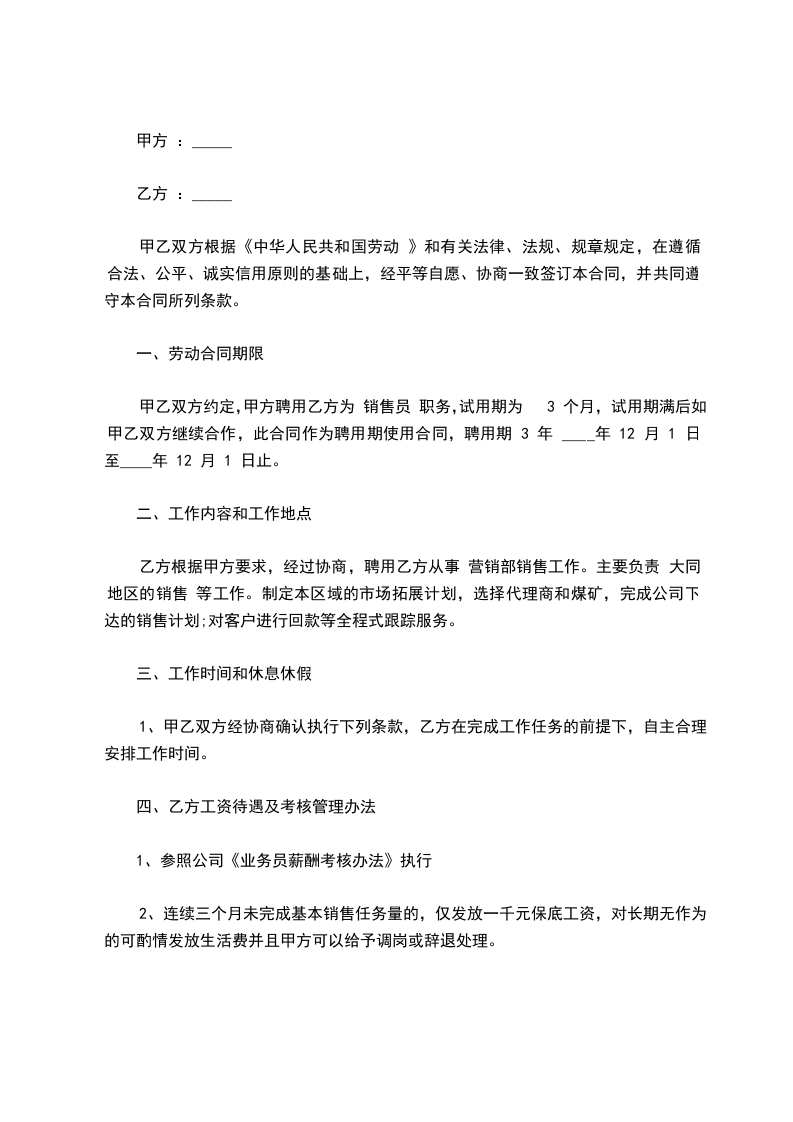 乙方根据甲方要求,经过协商,聘用乙方从事 营销部销售工作。主要负责 大同地区的销售 等工作。制定本区域的市场拓展计划,选择代理商和煤矿,完成公司下达的销售计划;对客户进行回款等全程式跟踪服务。