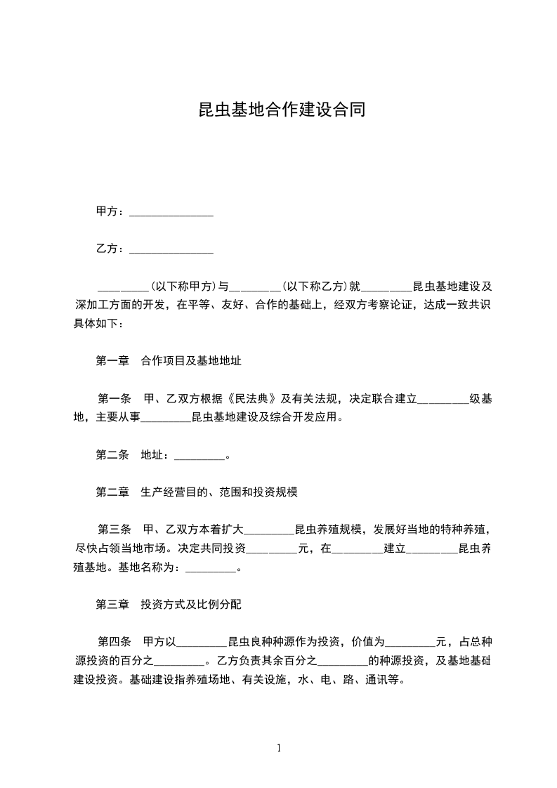 第四条甲方以_________昆虫良种种源作为投资,价值为_________元,占总种源投资的百分之_________。乙方负责其余百分之_________的种源投资,及基地基础建设投资。基础建设指养殖场地、有关设施,水、电、路、通讯等。