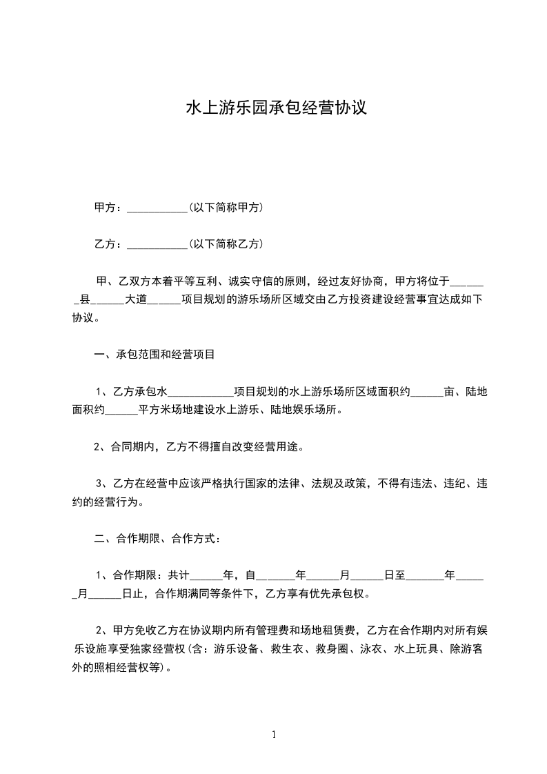 1. 乙方承包经营甲方的游乐场,经营范围包括但不限于游乐设施运营、场地出租、游乐项目服务等,具体以甲方提供的场地及设施现状为准。