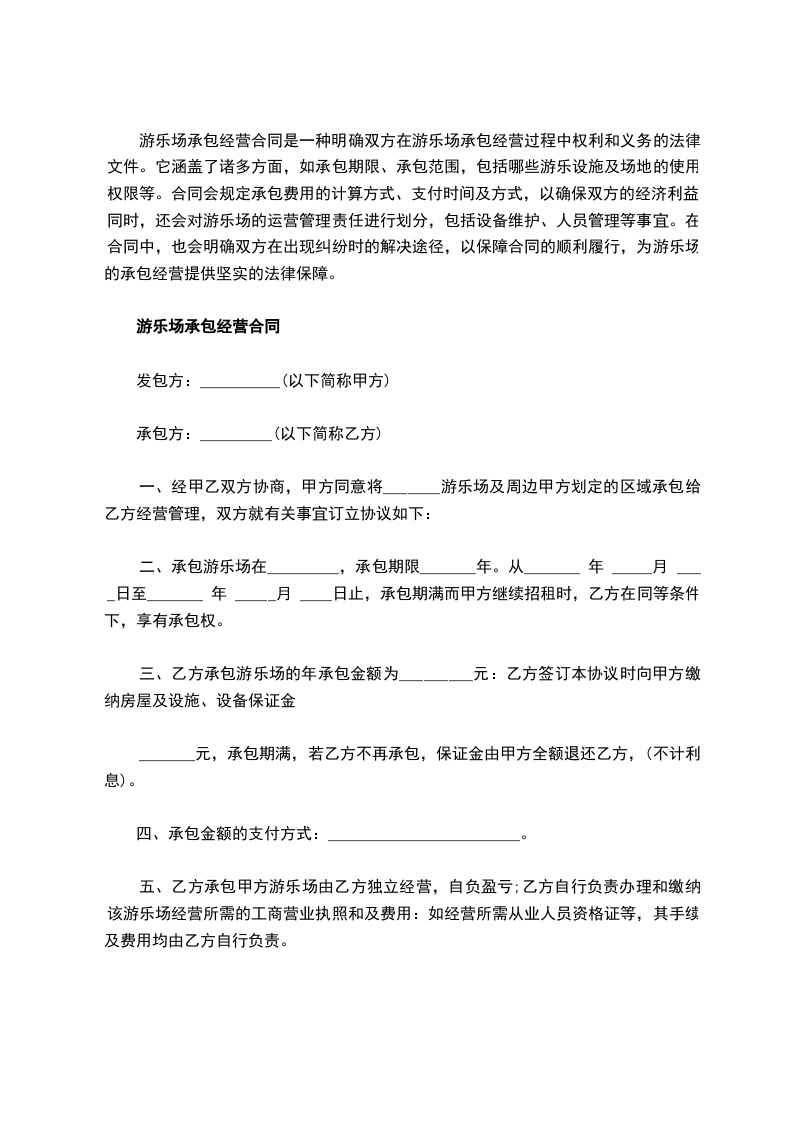 1. 乙方承包经营甲方的[游乐场名称]游乐场,经营范围包括但不限于游乐设施运营、场地租赁、相关游乐项目服务等,具体以甲方授权乙方经营的范围为准。