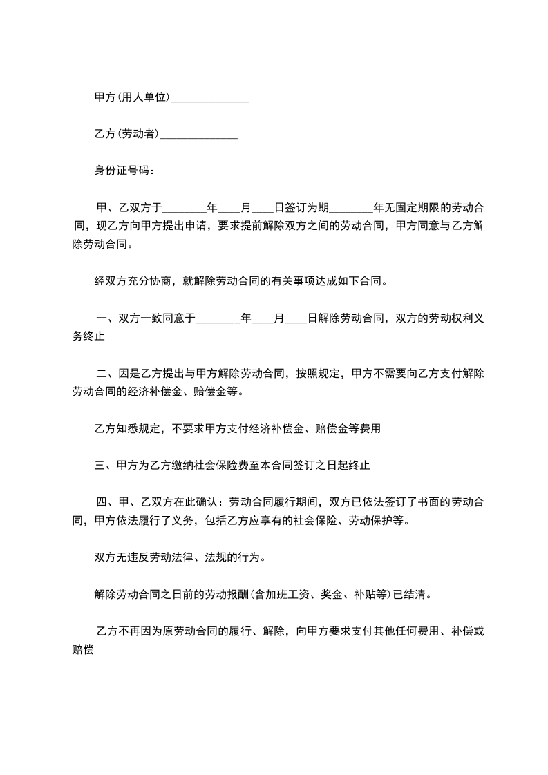 甲、乙双方于________年____月____日签订为期________年无固定期限的劳动合同,现乙方向甲方提出申请,要求提前解除双方之间的劳动合同,甲方同意与乙方解除劳动合同。